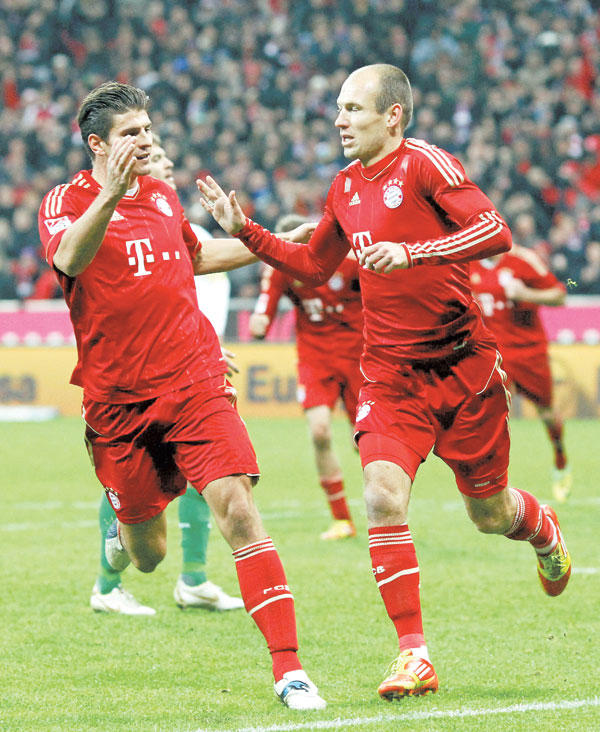 وفي مطلع الشوط الثاني، أرسل البيروفي كلاوديو بيتزارو كرة الى السويدي ماركوس روزنبرغ عند خط المنطقة فأطلقها الأخير مباغتة عانقت شباك الدولي مانويل نوير معلنة التعادل (52).ومن سوء طالع فيردر بريمن أن مدافعه اندرياس فولف ارتكب خطأ في المنطقة المحرمة ضد توماس مولر فاحتسبت ركلة جزاء انبرى لها الهولندي اريين روبن وسجل منها هدف التقدم من جديد لفريقه (69).وانفتحت شهية لاعبي الفريق البافاري وتعاون ماريو غوميز، متصدر ترتيب الهدافين، وريبيري وسجل الأخير الهدف الثاني الشخصي والثالث لفريقه (77) رافعا رصيده الى 8 أهداف في البطولة الحالية.وحصل بايرن ميونيخ على ركلة جزاء ثانية نتيجة مخاشنة اليوناني سوكراتيس باباستاثوبولوس لريبيري النشيط في هذه المباراة نفذها المتخصص روبن وسجل منها الهدف الرابع (83) بعد دقيقتين تماما من طرد لاعب وسط فيردر بريمن ارون هانت (81). دورتموند ومونشنغلادباخوفي الثانية على ملعب بوروسيا بارك، لم يستطع بوروسيا دورتموند فك الشراكة مع بوروسيا مونشنغلادباخ رغم تقدمه عبر البولندي روبرت ليفاندوفسكي، الذي افتتح التسجيل في وقت متأخر من الشوط الاول بعدما حصل فريقه على ركلة ركنية نفذها ماريو غوتسه وتابعها الأول برأسه في اسفل الزاوية اليمنى لمرمى مارك اندريه تير شتيغن (40) مسجلا هدفه العاشر منذ بداية الموسم.وفي الشوط الثاني، نظم بوروسيا مونشنغلادباخ صفوفه، وقام بهجمات خطيرة أسفرت إحداها عن التعادل حين مرر الارجنتيني راوول مارسيلو بوباديا الكرة الى ميكه هانكه الذي أطلقها دون تردد من حدود المنطقة فهزت بقوة شباك الحارس رومان فايدنفيلر (72).وفي مباريات أخرى تعادل فرايبورغ مع ضيفه هانوفر 1-1. وتعادل كايزرسلاوترن مع ضيفه هرتا برلين 1-1، وفرط فولفسبورغ بفوز كان في متناوله على ماينتس بعد ان تقدم في الشوط الأول بهدفين نظيفين قبل ان يعادل الفريق الضيف في الشوط الثاني.وكانت المرحلة افتتحت أمس الأول الجمعة بفوز باير ليفركوزن على ضيفه هوفنهايم، وتختتم اليوم فيلتقي هامبورغ مع نورمبرغ، وشالكه مع أوغسبورغ ضيف البطولة.(أ ف ب)