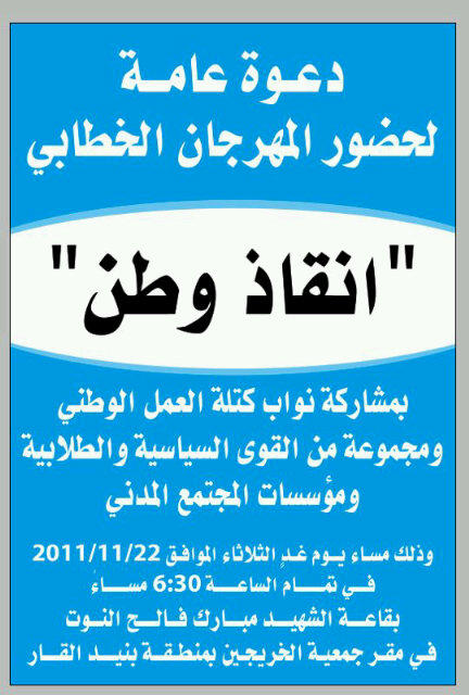 بمشاركة عدد من القوى السياسية والمدنية والطلابية وجمعيات النفع العام وكتلة العمل الوطني، تنطلق اليوم فعاليات المهرجان الخطابي "إنقاذ وطن" في قاعة مبارك النوت في جمعية الخريجين الكويتية.
