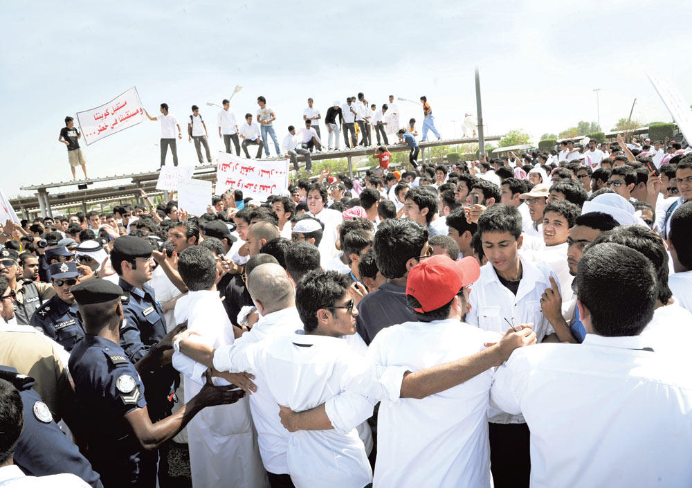 لم تعد الإضرابات والاعتصامات حكراً على التيارات والقوى السياسية والنقابات، إذ انتقلت عدواها إلى طلبة المدارس، الذين تجمهر منهم أمس ما يفوق 2000 طالب وطالبة أمام مبنى وزارة التربية (رقم 1)، مطالبين بإلغاء قرارات اعتبروها جائرة بحقهم، في وقت أجرى وزير التربية والتعليم العالي أحمد المليفي اتصالاً هاتفياً بمجموعة منهم ووعدهم ببحث مطالبهم خلال أسبوع واحد فقط.وتركزت مطالب الطلبة على ضرورة إلغاء القرارات الأخيرة الخاصة بتغيير آلية التقويم الجديدة، التي تم تطبيقها العام الدراسي الحالي، خصوصاً ما يتعلق بتقليل درجات الأعمال اليومية، رافعين شعارات "الطلبة يريدون تغيير النظام"، أي النظام التعليمي، و"لن نصمت"، و"لا ترموا الأحجار في طريقنا"، و"قتلتوا طموحنا"، في حين نادت أصوات باستقالة الوزير مرددة: "يسقط يسقط المليفي"، و"لا لا يا المليفي".