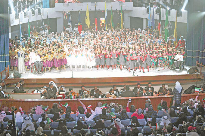 طرزت أجمل المعاني والكلمات المعبرة عن حب الوطن في أوبريت «تحيا الكويت» لوزارة التربية، بالتعاون مع معهدي الفنون الموسيقية والمسرحية.ليس مستغربا على المعهد العالي للفنون الموسيقية حيويته في المشاركات الوطنية، فمنذ أيام قليلة شارك في أوبريت «تحيا الكويت»، بمناسبة احتفالات الكويت بأعيادها الوطنية، ومرور قرن على التعليم النظامي، على مسرح جامعة الكويت بالخالدية، لمصلحة وزارة التربية بالتعاون مع معهد الفنون المسرحية، وبمشاركة من السلك العسكري و800 طالب وطالبة وموسيقي.كتب أشعار الأوبريت د. يعقوب الغنيم، الذي أشرف عليه أيضاً، وتصدى للتلحين وقيادة الفرقة الموسيقية عميد المعهد العالي للفنون الموسيقية د. سليمان الديكان، واخرجه مسرحياً عميد المعهد العالي للفنون المسرحية د. فهد السليم، وشارك في الأداء الغنائي: سناء الخراز، ود. عادل عبدالملك، وفراس التتان، وبدر نوري، وأماني الحجي، وحصة الشطي، وزينب خان، وبدور التتان، وفيصل الصراف.وتناول الأوبريت مراحل مسيرة التعليم النظامي في دولة الكويت منذ اللبنات الأولى حتى يومنا هذا، الذي مر بمراحل متعددة شهدت ازدهارا ونهضة وتطويرا في عهد سمو أمير البلاد الشيخ صباح الأحمد.عشر لوحاتتضمن الأوبريت عشر لوحات غنائية مستمدة من الفنون الشعبية الكويتية، الأولى (عرضة) بعنوان «تحيا الكويت»، حيث يبدأ الأوبريت بعمل غنائي ملحمي تاريخي درامي عن فترة حكم الشيخ مبارك الكبير بعد الانتهاء من رد الغزوات عن الكويت، حيث بدأ الشيخ مبارك يضع قواعد جديدة لحركة التعليم بالبلاد في مطلع القرن العشرين، خاصة بعد أن نشطت حركة التجارة، حيث يتم تجميع الأشبال حول سارية العلم وهم يهتفون تحيا الكويت.اقتطفنا من كلمات اللوحة: «يا بو ناصر شيخنا/ سمعا وطاعة، يا صباحٍ بيننا/ نَور شعاعه، إحنا ما نرتاح إلا/ وأنتَ مرتاح معانا، يهدا بال الشعب كله/ بوجودك في حمانا، يا أمير الفعل والقول الرشيد/ لك علينا نتبعك فما تريد».أما اللوحة الثانية (قادري بحري) «الافتتاحية»، عن الكويت القديمة والدراسة عند الكتاتيب، ثم بدء التعليم النظامي في مدرسة المباركية عام 1911، حيث يقدم الفلكي والمؤرخ الكويتي د. صالح العجيري سردا تاريخيا عن تلك المرحلة، وضمت اللوحة ما يردد في الكتاتيب قديماً: «الحمد لله الذي هدانا... آمين/ للدين والإسلام اجتبانا... آمين».اللوحة الثالثة (مارش) عن امتداد انجازات التعليم ومدرسة الأحمدية التي أنشئت عام 1921: «أشعب الكويت لك البُشرى/ فمجدك يا وطني ازدهرا، وطالع سعدك مبتسم/ في عهد حزت به الفخرا».اللوحة الرابعة (صوت شامي وفن سامري نقازي) عن مجلس المعارف نواة تكوين وزارة التربية، وغنى البنين الصوت الشامي، وهو نص د. الغنيم: «يا شمس تضوي دربنا/ يا قلب طيَّب ضمنا، انت الهوي وانت ترى/ هدية الدنيا. لنا»، ثم أدت البنات مقطعا من قصيدة الشاعر عبدالله سنان من السامري النقازي: «إن الكويت قد اكتست/حلل الفخار الناصعة، أعلامها خفاقة/ فوق السواري الفارعة، فاسلمي للعلى وانعمي».اللوحة الخامسة (فن سواحلي) مرحلة الاستقلال ورفع العلم الجديد وتسمية وزارة التربية والتعليم ومكافحة الأمية: «يا علمنا/ عشت في عالي سمانا، يا علمنا نفتخر وانت معانا» ثم غنت مجموعة البنات من فن فرينسي: يا بلدنا يا بلدنا/ يا وطن غالي علينا، انت بالدنيا ذِخِـرنا/ مثل طِيبك ما لقينا». بدء التعليمأما اللوحة السادسة (بستة ودزة) فكانت عن بدء التعليم العالي: «يا بلادي... يا بلادي عِشتِ تَعْلوكِ البنود/ فانعمي رغم الأعادي بالخلود/ كلنا للوطن الحُر جنود/ نُرخص الغالي وبالروح نجُود/ قد تكاتفنا وهذا جَمْعُنا/ يبذل الحب إليك والعهود».اللوحة السابعة (أقبل الخير) إيقاع ردحة: «أقبل الخير قومي يا بلادي/ جاك مْنهو محب للرعايا، جا صباح اللي عليه الاعتماد/ يركب العالي ولا يرضي الدنايا/ ضمّنا من بين حضر أو بوادي/ نطلب العز ونصد الرزايا».اللوحة الثامنة عن الدستور الكويتي: صوت شامي «قد أشرق الدستور/ في دارنا بالنور، يمضي على الآفاق/في خ