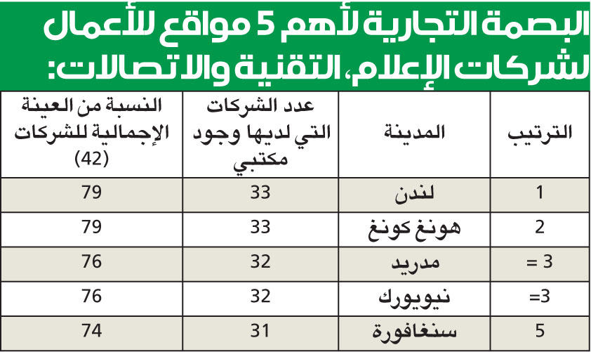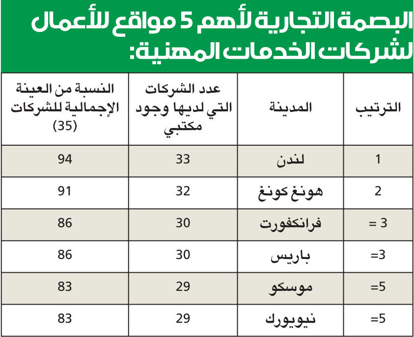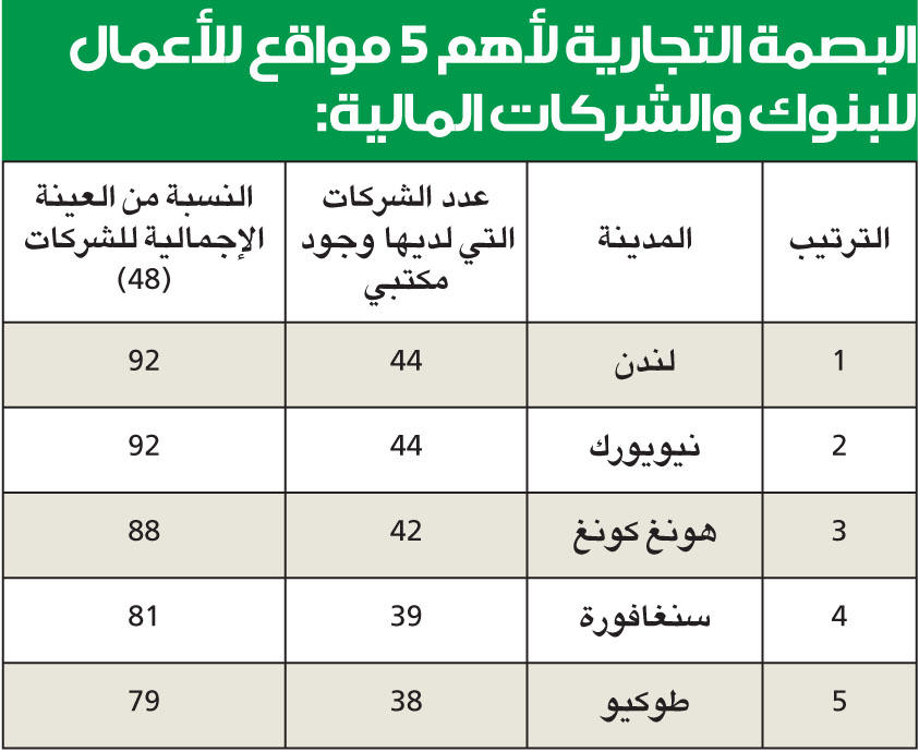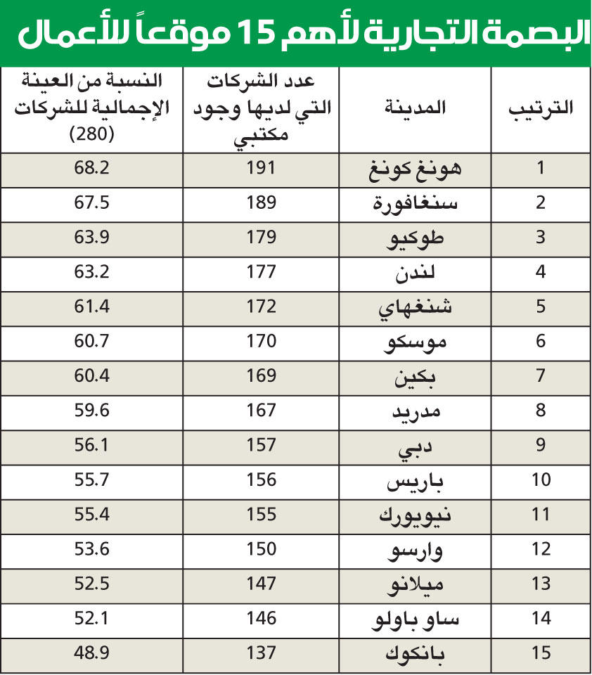 يصنف تقرير البصمة التجارية هونغ كونغ، في المرتبة الأولى باعتبارها الموقع التجاري الأول في العالم، تليها سنغافورة (67.5٪) وطوكيو (63.9٪)، بينما تأتي لندن في المرتبة الرابعة كأكثر المواقع التجارية شعبية في العالم (63.2٪)، وتأتي في قائمة الخمسة الكبار مدينة شنغهاي (61.4٪).دخلت دبي قائمة أهم عشرة مواقع تجارية شعبية في العالم وفقاً لتقرير البصمة التجارية للأعمال، الجديد الصادر عن سي بي ريتشارد أليس (CBRE) التي تعد أكبر شركة للخدمات العقارية في العالم.ويقوم التقرير الذي يعتبر الأول من نوعه بدراسة البصمة التجارية العالمية لـ 280 شركة دولية كبرى ضمن 101 بلداً في 232 مدينة مختلفة.ومن ضمن تلك الشركات التي تمت دراستها، تمتلك ما يزيد قليلاً عن نصف هذه الشركات (56.1 في المئة) مكاتب لها في دبي، لتحتل بذلك المرتبة التاسعة، في حين احتلت دولة الإمارات العربية المتحدة ككل المرتبة 15 ضمن ترتيب البلدان، مع وجود 171 شركة (61.1 في المئة).هونغ كونغ الأولىويصنف تقرير البصمة التجارية هونغ كونغ، التي يوجد فيها 68.2 في المئة من الشركات التي شملتها الدراسة، في المرتبة الأولى باعتبارها الموقع التجاري الأول في العالم، تليها سنغافورة (67.5 في المئة) وطوكيو (63.9 في المئة)، بينما تأتي لندن في المرتبة الرابعة كأكثر المواقع التجارية شعبية في العالم (63.2 في المئة)، وتأتي في قائمة الخمسة الكبار مدينة شنغهاي (61.4 في المئة).ويقارن التقرير تواجد مكاتب الشركات العالمية ضمن مجموعة من القطاعات المختلفة. ففي قطاع السلع والخدمات الصناعية، تحتل دبي المرتبة 7 عالمياً، مع تواجد 23 من الشركات التي شملتها الدراسة الحالية. وهذا يمثل 70 في المئة من العدد الكلي لشركات هذا القطاع. ويعزى ذلك إلى حقيقة أن دبي تستخدم في كثير من الأحيان كمقر إقليمي للشركات، والتي تقوم بإدارة مرافق الإنتاج في الدول المجاورة من خلال ذلك المقر.وقد برزت دبي كمركز رئيسي يقع بين أوروبا والشرق الأقصى وكقاعدة لممارسة الأعمال التجارية وخدمة مواقع مثل السعودية وباكستان. ويمكن القول إنها بذلك تشكل تحدياً لسنغافورة على هذا الدور العالمي.مزيج متوازن وقال نك ماكلين المدير العام لسي بي ريتشارد أليس في منطقة الشرق الأوسط: "يمكن للتوجه المستمر في نقل أجزاء من الأعمال نحو مواقع التجارة الحرة، بدافع توفير التكاليف وخفض النفقات، أن يؤدي إلى توزيع الأنشطة التجارية على نطاق أوسع وتخفيض تركيز الشركات في بعض المدن"، كما أن دبي تمتلك مزيجاً متوازناً نسبياً من المستأجرين. فعلى مدى السنوات الـ 10 الماضية، تم تصميم المدينة وتشييدها بهدف جذب الشركات الدولية الكبرى ضمن مجموعة واسعة من القطاعات.وبينما ساعد عدد من المبادرات الحكومية والإعفاءات الضريبية على حدوث ذلك، كان من المستحيل تحقق ذلك من دون المرونة التي توفرها التقنيات الجديدة وأنظمة تقنية المعلومات.ويشير التقرير أيضاً إلى دخول نسبة كبيرة من الشركات العالمية إلى عدد من المدن الأقل نمواً في الأسواق الناشئة، فبينما تأتي دبي في المرتبة التاسعة كأكثر مواقع الأعمال شعبية، تحتل وارسو المرتبة 12، مما يعكس حقيقة أن كلتا المدينتين استطاعت تطوير نفسها لتكون مركزاً تجارياً استراتيجياً في المنطقة المجاورة لها.وفي حين تعتبر وارسو مركزاً تجارياً مهماً في أوروبا، فإن وجود بودابست (20)، براغ (21)، وبوخارست (29) في قائمة أهم 30 موقع يسلط الضوء على الأهمية المتزايدة لعدة الأسواق في وسط وشرق أوروبا للشركات الدولية العاملة في أوروبا.الأكثر شعبيةوقال ريتشارد هولبرتون، مدير البحوث لمنطقة أوروبا، الشرق الأوسط، وإفريقيا لدى سي بي ريتشارد أليس: "وجدت دراستنا أن أكثر من نصف المواقع الأكثر شعبية للمكاتب في العالم هي خارج الدول المتقدمة اقتصادياً مما يؤكد الأهمية الكبرى التي توليها الشركات للوصول إلى أسواق جديدة لتغذية نموها".وأضاف: "من المثير للاهتمام ما نلاحظه في المرتبة التي حصل عليها عدد من الأسواق الناشئة مقارنة بمدن الاقتصادات المتقدمة، فعلى سب