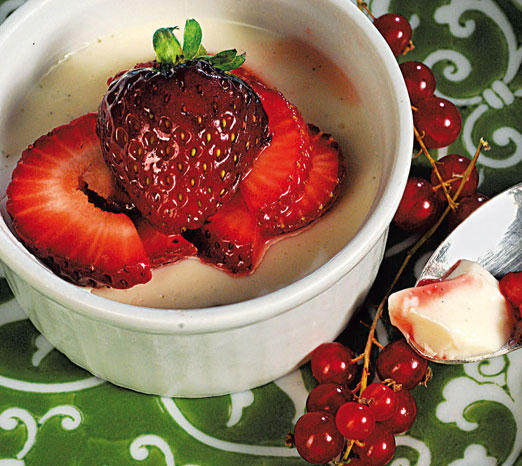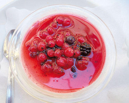 بانا كوتا بإكليل الجبل والعنبية (8 أشخاص)المقاديرالعنبية (blueberry) المخللة:- 4 أكواب من عصير العنب.- كوب من الخل البلسمي.- كوب من السكّر.- ساق من إكليل الجبل.- سلة من العنبية أو أكثر.بانا كوتا بإكليل الجبل:- 6 أوراق من الجيلاتين.- ليتر من الكريما الكثيفة.- ربع كوب من إكليل الجبل المقطّع.- نصف كوب من السكّر.الطريقة-1 اغسلي المرطبان وغطاءه بالماء المغلي.-2 ضعي الخل والعصير والسكّر في قدر واتركيها على النار حتى تغلي. ضعي العنبية وإكليل الجبل في المرطبان، وصبي خليط الخلّ الساخن فوقهما إلى أن يغطيهما بالكامل. أقفلي المرطبان بإحكام في الحال واتركيه جانباً ثلاثة أيام.-3 انطلقي في إعداد البانا كوتا بنقع أوراق الجيلاتين بالماء البارد.-4 في قدر متوسطة الحجم، ضعي الكريما وإكليل الجبل واتركيهما على النار إلى أن يغليا، ثم أطفئي النار وأضيفي إليهما السكّر.-5 أخرجي الجيلاتين الطري من الماء واعصريه لتتخلصي من السوائل، ثم أضيفيه إلى الكريما وحركيها إلى أن يذوب الجيلاتين.-6 صفّي خليط الكريما ووزعيه على ثمانية قوالب صغيرة وضعيها في البراد طوال الليل أو إلى أن يجمد محتواها.-7 غطي سطح البانا كوتا بقليل من العنبية المخللة ورشّة من الخل البلسمي المخفف بالماء، إن شئت.ملاحظة: تُقدم هذه الوصفة أيضاً مع قليل من الخلّ البلسمي المخفف بالماء. تحتاجين إلى 3 أيام لتخللي العنبية.كيت كيرنوزياك، مساعدة طاهٍ، مطعم كريدو بسان فرانسيسكو.بانا كوتا بالجبنة وصلصة البلويوت (24 شخصاً)المقادير- 6 أكواب من خليط الكريما والحليب (half and half).- 6 أكواب من الكريما.- نصف ملعقة صغيرة من الملح.- ملعقة صغيرة ونصف الملعقة من حبوب الهال الخضراء المحمصة والمسحوقة.- 16 غراماً من إكليل الجبل المنزوع الساق والمقطع.- 16 ورقة جيلاتين منقوعة في ماء بارد.- ثلاثة أكواب ونصف الكوب من الجبنة الطرية.- كوبان من السكّر الناعم.- ملعقة كبيرة من معجون الفانيلا.- كوب من صلصة فاكهة البلويوت (Pluot) (راجعي الصلصة أدناه).- قليل من شرائح البلويوت.الطريقة-1 ضعي خليط الكريما والحليب مع الكريما على النار إلى أن تصل حرارتهما إلى 65 أو 70 درجة مئوية. أضيفي إليهما الملح والهال وإكليل الجبل واتركي النكهات تختلط حوالى 30 دقيقة.-2 صفي أوراق الجيلاتين وضعيها في وعاء كبير. أعيدي تسخين خليط الكريما وصبيه فوق الجيلاتين بعد تصفيته. اخفقيه مع الجيلاتين إلى أن يذوب هذا الأخير، ثم ضعي المزيج جانباً حتى يبرد.-3 في خلاط كهربائي، امزجي الجبنة الطرية مع السكّر ومعجون الفانيلا إلى أن تحصلي على خليط طري ومتجانس.-4 أخرجي خليط الجبنة من الخلاط وأضيفي إليه مزيج الكريما البارد. مرري هذا الخليط مجدداً عبر مصفاة وضعيه في قوالب صغيرة وغطيها بورق بلاستيكي واتركيها في البراد ما لا يقل عن 4 ساعات.-5 قبل التقديم مباشرة، ضعي القوالب كل واحد على حدة في وعاء من الماء الساخن لثلاث ثوانٍ. احرصي على أن يغمر الماء نصف القالب تقريباً، ثم مرري سكيناً رقيقة حول أطراف كل قالب واقلبيه رأساً على عقب وسط طبق صغير. زيني كل قطعة بانا كوتا بملعقة من صلصة البلويوت وبضع قطع من هذه الفاكهة.صلصة البلويوت المقادير- كيلوغرام من فاكهة البلويوت.- ملعقة كبيرة من عصير البرتقال.- ملعقتان كبيرتان من السكّر.- ¼ ملعقة صغيرة من الفانيلا.الطريقة-1 قطعي ثلاث حبات من البلويوت إلى مثلثات.-2 قشري ما تبقى من هذه الفاكهة وقطعيه. أضيفي إليه العصير والسكّر والفانيلا واطهي هذا المزيج على النار حتى يتحول إلى ما يشبه العصير. اتركيه جانباً ليبرد ثم اطحنيه. أضيفي إليه بعد ذلك مثلثات البلويوت واخلطيها جيداً مع الصلصة.ملاحظة: يساعدك نقع الجيلاتين من 3 إلى 5 دقائق في الحصول على نتيجة نهائية ممتازة.باتي ديلامونيكا-بولر، طاهية حلوى، مجموعة مطاعم لارك غريك.بانا كوتا بالفراولة (12 شخصاً)المقادير- ملعقة كبيرة من الجيلاتين غير المنكه.- نصف كوب من الحليب.- 4 أكواب من الكريما الكثيفة.- ثلاثة أرباع كوب من السكّر.- حبة فانيلا مقطعة بالطول إلى قسمين.الفاكهة:- 4 أكواب من ال