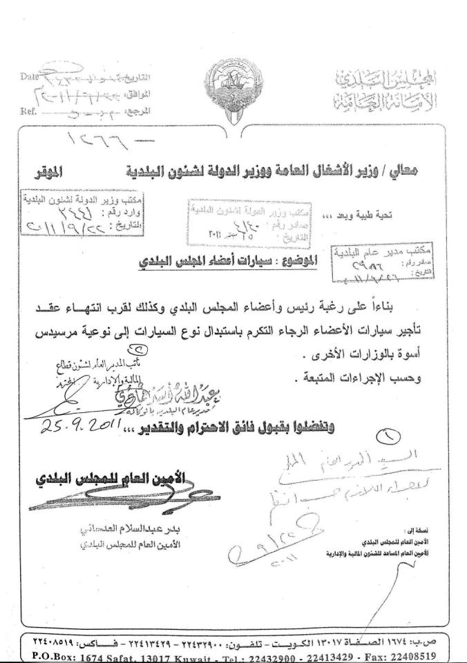 وفي التفاصيل، أن مكتب الوزير صفر تلقى كتاباً موقعاً باسم رئيس المجلس البلدي، ويحمل الرقم (33441)، يتضمن طلباً إلى الأمانة العامة باستبدال سيارات الـBMW التي "يمتطيها" أعضاء مجلسه "البلدي" بأخرى من نوع مرسيدس، كتلك التي "يكشخ" بها نواب "الأمة".