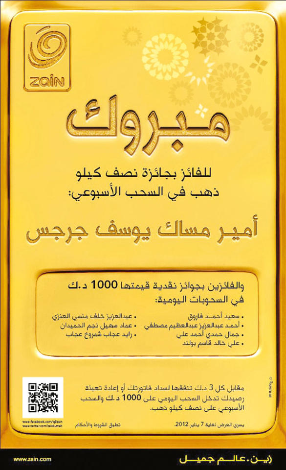 أعلنت شركة زين، أكبر شبكة اتصالات في الكويت، فوز أمير مساك يوسف جرجس بجائزة النصف كيلو غرام من الذهب، وذلك بعد السحب الأسبوعي الخامس الذي أجرته في حملتها "اربح ذهب" ، التي أطلقتها لعملائها من أصحاب خطوط إيزي وخطوط الفواتير. وذكرت الشركة أن الحملة التي أطلقتها مؤخراً تسمح لكل عميل في شركة زين بالدخول في سحب أسبوعي على جائزة نصف كيلو غرام من الذهب، إضافة إلى جوائز نقدية يومية بقيمة 1000 دينار. وأشارت الشركة إلى أن كل عميل سيقوم بدفع الفواتير المستحقة، أو بتعبئة خط الدفع المسبق (ايزي) سوف يكون مؤهلاً للدخول في السحوبات اليومية على المبالغ النقدية، كما سيكون لديه فرصة للفوز بنصف كيلو من الذهب مع نهاية الأسبوع. وأوضحت أنه مع كل مبلغ نقدي بقيمة 3 دنانير يحصل العميل على نقطة واحدة لدخول السحب وكلما زادت النقاط زادت فرص الفوز في هذه السحوبات. وانتهزت الشركة هذه الفرصة لتهنئة الفائز الخامس في سحوباتها الأسبوعية، مبينة أن جميع عملائها مدعوون للاستفادة من هذه السحوبات، مشيرة إلى أنها أطلقت هذه الحملة رغبة منها في إضفاء بعد جديد في علاقتها مع عملائها، والتي تسعى باستمرار إلى تعزيزها بكافة وسائل الاتصال سواء كانت مباشرة أو غير مباشرة. واعتبرت "زين" فعاليات هذه الحملة وسيلة اتصال مباشرة مع عملائها حيث تحمل معها قيمة مضافة، مبينة أن عميل الـ"إيزي" بإمكانه الفوز بجوائز نقدية يومية، وكذلك أصحاب الخطوط آجلة الدفع الذين لديهم نفس الفرصة أيضاً وفي نفس الوقت ستساعدهم هذه الحملة في الحفاظ على أن يكون لهم سجل ائتماني سليم مع الشركة، مع سداد المبالغ المالية للفواتير. وذكرت الشركة أنها دائما ما تجدد التزامها اتجاه عملائها بما هو جديد في صناعة الاتصالات وبما يقدم لهم قيمة مضافة، مشيرة إلى ان طرح هذه المسابقة يأتي في هذا الإطار، حيث توفر فرصة رائعة للحوار المباشر مع عملائها.