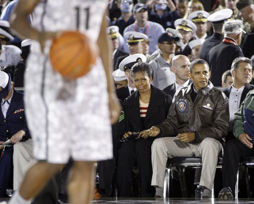 حضر الرئيس الاميركي باراك اوباما الجمعة مباراة جامعية في كرة السلة على حاملة الطائرات الاميركية كارل-فينسون وهي السفينة الحربية التابعة للبحرية الاميركية التي اقيمت عليها المراسم الجنائزية لاسامة بن لادن.