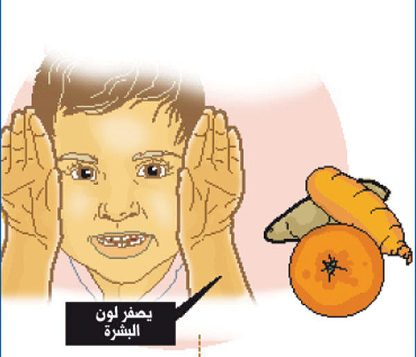 أصباغ تتوافر في الخضر وبعض الفاكهة الصفراء، منها:• الجزر، القرع، البطاطا الحلوة.• البرتقال، المشمش، الدراق.اختلافها عن اليرقان • مع اليرقان، يصفرّ الجزء الأبيض من العين (الصلبة)، فضلاً عن البشرة.• سبب اليرقان الأكثر شيوعاً بين الأطفال غير المولودين حديثاً التهاب الكبد، حالة تتطلب علاجاً تحت إشراف طبيب.اتصل بالطبيب في حال...• تقيأ الطفل دماً.• فَقَدَ تركيزه وصعب عليه الاستيقاظ.• اشتدّ عليه المرض.