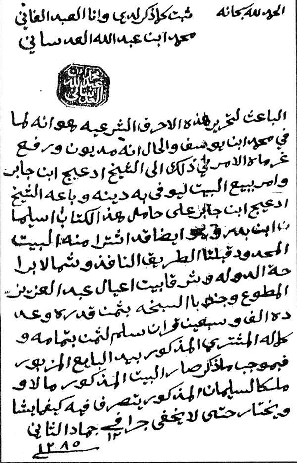 ولابد من الإشارة بشكل خاطف إلى عراقة هذه الأسرة الشهيرة ومساهماتها الكثيرة في التاريخ الكويتي، فقد أنجبت عائلة القناعات شخصيات كثيرة، لا يمكن حصرها في هذه المقالة المتواضعة، وكان لها دور كبير في المجال السياسي والاقتصادي والديني والاجتماعي والخيري والعلمي، وغير ذلك، وربما تتاح لي الفرصة في المستقبل لأتحدث عن بعض المساهمات المهمة في هذا الصدد.نعود إلى فريج القناعات فنقول إن معظم سكانه من أسر القناعات، وفيه يوجد مسجد المطوع الذي تأسس عام 1287هـ الموافق 1870م (يقع خلف موقع البورصة وعلى شارع علي السالم وهدم عام 1987)، وكان إمامه الملا أحمد بن محمد القطان، وأعقبه الملا جاسم بن محمد المطوع، وأذّن فيه المرحوم محمد بن حمود الشايع، والشيخ يوسف بن سند الدوب. كما يوجد فيه مسجد الحمدان، الذي أسسه محمد بن باشق الحمدان القناعي عام 1260هـ الموافق 1844م، وصلى فيه إماماً لفترة طويلة الشيخ عبدالحي بن سيف، وأعقبه الشيخ عبدالرزاق الصالح المطوع.أما المؤذنون فكان منهم المرحوم حسين بن راشد الدوب، والمرحوم محمد بن سلامة.كما يوجد في هذا الفريج حفرة "المسلم"، وهي حفرة كبيرة تتجمع فيها مياه الأمطار وتقع أمام بيوت المسلم.وقد سكن في هذا الفريج العديد من العائلات، منها: بيت عبدالرزاق المطوع، بيت الشيخ عبدالله الخليفة الصباح، بيوت السداني، بيت عبدالمحسن المسلم، بيت فهد المسلم، بيت خليفة المسلم، بيت الشمالي (الهولي)، وبيت سليمان بن جاسم الغانم، وبيت الكاظمي، وبيت سيد جواد الناصر، وبيت بدر يوسف البدر، وبيت الشيخ يوسف بن عيسى القناعي، وبيت يعقوب يوسف المطوع وأولاده، وبيت صالح المسلم وأولاده، وبيت أحمد عبداللطيف بوحمدي، وبيت عبدالله محمد الأيوب، وبيت مبارك العلي، وبيت علي عبدالوهاب المطوع، وبيت يوسف عبدالعزيز المطوع، وبيت أحمد عيسى القناعي، وبيت حسين عيسى القناعي، وبيت عبدالمجيد الخنفر، وبيت سيد طالب بهبهاني، وبيت عبدالله القطان، وبيت مصطفى العريان، وبيت أحمد العريان، وبيت النيباري، وبيت أحمد وجاسم الصالح، وبيت عبدالكريم حجي قاسم، وبيت حسن وعباس ششتر، وبيت حسين الفيلكاوي، وبيت عبدالمحسن العلي، وبيت علي البحر، وبيت يحيى الأيوب، وبيت الدولة، وبيت صالح محمد المطوع، وبيت أمان، وبيت عبداللطيف المطوع، وبيت خليفة الجاسم، وبيت الرقم، وبيت بن ناجي، وغيرهم.والوثيقة المنشورة اليوم، وهي من مقتنيات مركز المخطوطات والتراث والوثائق بالجابرية، وثيقة عدسانية تعود إلى عام 1285هـ الموافق 1868م، وفيها اشترى سليمان بن بدر القناعي بيت محمد بن يوسف المطوع، ويقع البيت في فريج الجناعات بجوار براحة الدولة، وبيت أبناء عبدالعزيز المطوع. هذا ما يسمح به المجال في هذه الحلقة، وأرحب بأي تعليقات أو ملاحظات حول المعلومات المنشورة.