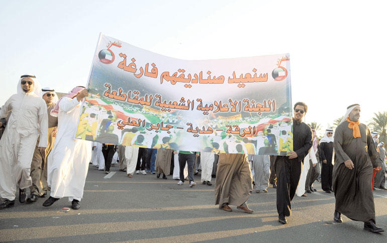 وجود أمنيوشهدت منطقة أبراج الكويت حالة من الوجود الأمني الكثيف، حيث اصطف رجال الأمن على جانبي الطريق لتأمين التظاهرة وتحديدا من منطقة أبراج الكويت حتى فندق سفير.تخلل الساعتين اللتين حددتهما وزارة الداخلية للتظاهرة من الثالثة إلى الخامسة عصرا وجود أمني كثيف، إضافة إلى عشرات الآلاف من المتظاهرين، كما شوهد عدد من طائرات الهليكوبتر تحلق فوق منطقة التظاهرة، كما أغلقت وزارة الداخلية شارع الخليج أمام مرور السيارات وسمحت للمارة فقط بالعبور في الشارع أثناء التظاهرة وعادت وفتحت الشارع أمام السيارات عقب الانتهاء من التظاهرة، تحديدا، عند الساعة الخامسة عصرا.وقد انطلقت التظاهرة عند الساعة الثالثة تماما من أمام فندق سفير مرورا بشارع الخليج ووصلت عند الساعة الثالثة والثلث عصرا إلى منطقة الأبراج، ورفع المتظاهرون لافتات كبرى كتب عليها عبارات مثل "مقاطعون" و"كرامة وطن 3" و"مقاطعة". وكانت كلها باللون البرتقالي.شعاراتوردد المتظاهرون شعارات مثل "الشعب يريد إسقاط المرسوم"، "واحد. واحد. واحد. الشعب ما يبي الصوت الواحد"، و"الصوت الواحد باطل".من جهته، حذر عضو مجلس الأمة السابق أحمد السعدون من وجود مندسين في المسيرة، مؤكدا أنه سيتم تسليمهم إلى رجال الشرطة فور ضبطهم.«الداخلية» تشيد بتعاون المنظمينأشاد مصدر امني مطلع بالتعاون الذي أبداه المشرفون على تنظيم مسيرة "كرامة وطن 3"، وتعاونهم الكبير مع رجال الأمن من أجل إنجاح المسيرة وعدم حدوث أية مشاكل.وقال المصدر إن القوات الأمنية الموجودة في التجمع كان مطلوباً منها حماية وتأمين التجمع، لافتا إلى أن الحراك ظل سلميا، وأن المنظمين التزموا بالتعهد الذي وقعه زملاؤهم الذين طلبوا الترخيص، كما التزموا بخط سير المسيرة والوقت المحدد لها.ونفى المصدر وقوع أي احتكاك بين الحضور ورجال الأمن، لافتا إلى أن الجميع كانوا متعاونين بشكل كبير مما سهل عمل الأجهزة الأمنية.9 سيارات إسعاف تواكب المسيرةاستعدت إدارة الطوارئ الطبية للمسيرة، ووضعت خطة لتغطية التجمع، حيث قام قسم العمليات في إدارة الطوارئ الطبية بالتنسيق مع وزارة الداخلية لمعرفة سير المسيرة.وقال مسؤول الإعلام في إدارة الطوارئ الطبية عبدالعزيز بوحيمد إن الإدارة استعدت للمسيرة بـ9 سيارات إسعاف، بواقع 3 سيارات في ساحة المسجد الكبير، ومثلها في ساحة مطعم ميس الغانم القديم، ومثلها في منطقة السفارات مع وحدة الإمداد.وقال بوحيمد في تصريح لـ"الجريدة" إنه تم توزيع ضباط اتصال وضباط مواقع وفتح موجة خاصة للحدث وتشكيل فريق إعلامي لتغطية التجمع، مشيرا إلى إبلاغ قسم العمليات في مستشفى الأميري ومستشفى مبارك الكبير (المساند للأول)، بالاستعداد وكذلك غرفة الطوارئ المركزية في الإدارة. لقطاتحضور إعلامياهتم عدد من وسائل الإعلام العالمية بتغطية المسيرة، حيث حضر العديد من الوسائل الأجنبية سواء من الصحف أو الإذاعات، ومن بينها وسائل بريطانية وأميركية وفرنسية لتغطية المسيرة.حضور نسائي لافتبدا لافتا حضور أعداد غفيرة من النساء خلال المسيرة وارتدى عدد كبير منهن اللون البرتقالي ورفعن لافتات تظهر مطالبهن ورفضهن للصوت الواحد ورفضهن المشاركة في الانتخابات البرلمانية التي تنطلق اليوم.نواب المعارضةحضر التظاهرة أغلب نواب المعارضة السابقين، ومن بينهم أحمد السعدون ومسلم البراك وأسامة الشاهين ومحمد الدلال وعبدالرحمن العنجري ووليد الطبطبائي وعادل الدمخي وجمعان الحربش وغيرهم.ساعة و50 دقيقةبدأت المسيرة في تمام الثالثة عصرا وانتهت في الرابعة وخمسين دقيقة عصرا. وكانت الأعداد الغفيرة قد بدأت في التوافد على شارع الخليج العربي منذ الواحدة ظهر أمس الجمعة.بر وبحر وجوكان الحضور الأمني الكثيف لافتا في محيط المسيرة، حيث شوهد حضور رجال الأمن في المسيرة على جانبي شارع الخليج، إضافة إلى وجود رجال خفر السواحل في البحر، كما شوهدت طائرات الهيلكوبتر تحلق في الجو أثناء المسيرة.تجاوزات بسيطة شابت المسيرة تجاوزات بسيطة تمثلت في تخط