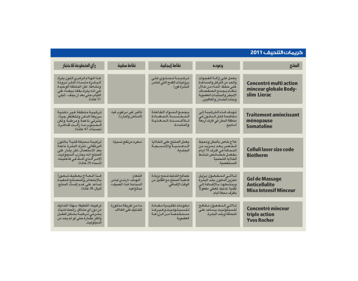 في الصيف، نرغب في التخلص من السيلوليت الذي يشوه بشرتنا... فتظهر سنوياً كريمات جديدة يزعم صانعوها أنها فاعلة في عملية التنحيف.لمَ لا نجربها؟ إليك بعض النصائح والاختبارات التي تساعدك على اختيار الأنسب لك.