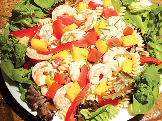 توفر المانغا مذاقاً حلواً يتناقض مع طعم مقادير هذه السلطة المصنوعة من الروبيان والمانغا والباستا.يمكن إعداد هذه السلطة السريعة التحضير والمناسبة لوقت العشاء قبل ساعات عدة ووضعها في البراد حتى وقت تناولها. لكن يجب وضعها على حرارة الغرفة قبل تقديمها.
