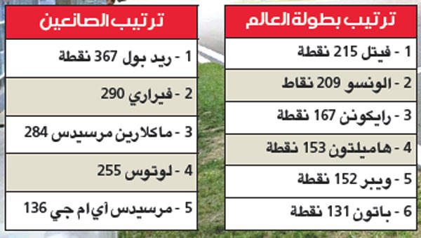 انتزع سائق ريد بول- رينو الألماني سيباستيان فيتل حامل اللقب في العامين الماضيين المركز الاول في بطولة العالم لسباقات الفورمولا واحد من الاسباني فرناندو الونسو (فيراري) بعد فوزه بسباق جائزة كوريا الجنوبية الكبرى، المرحلة السادسة عشرة (من أصل 20)، امس على حلبة يونغام.وبعد أن قلص فيتل الفارق الذي يفصله عن الونسو الى اربع نقاط بفوزه بالسباق الماضي في اليابان قبل اسبوع، نجح في كوريا الجنوبية في تكرار الفوز وانتزاع الصدارة رافعا رصيده الى 215 نقطة، تاركا المركز الثاني لالونسو بطل العالم عامي 2005 و2006 وله 209 نقاط.