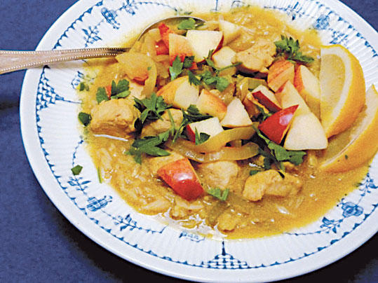 ابتكرت هذه النسخة الحادة التي يستلزم تحضيرها 20 دقيقة عبر استعمال بودرة الكاري التجارية وحليب جوز الهند المعلّب والقليل الدسم.يصبح مذاق هذا الحساء رائعاً في اليوم الثاني. إذا كنت تملكين الوقت الكافي، ننصحك بتحضير كمية مضاعفة.قدمي الطبق مع الرز الأبيض المسلوق في الميكروويف بمعدل ¾ كوب من الرز المطبوخ لكل فرد.المقادير- ملعقتان صغيرتان من الزبدة.- كوب من البصل المقطّع.- نصف كوب من الجزر المقطّع.- نصف كوب من الكرفس المقطّع.- 220 غراماً من شرائح صدر الدجاج المسحّب والمنزوع الجلد.- نصف ملعقة كبيرة من بودرة الكاري.- ملعقة كبيرة من الطحين. - ملعقة كبيرة من الزنجبيل الطازج والمفروم أو ملعقة صغيرة من الزنجبيل المطحون.- كوب ونصف الكوب من مرق الدجاج قليل الدسم وقليل الملح.- كوب ماء.- نصف كوب من حليب جوز الهند القليل الدسم.- ملح وفلفل أسود مطحون.- كوب من مكعبات التفاح.- ملعقتان كبيرتان من الكزبرة الطازجة المفرومة (اختياري).- أربع شرائح من الليمون.الطريقة-1 سخني الزبدة على حرارة متوسطة في مقلاة كبيرة غير لاصقة. أضيفي البصل والجزر والكرفس والدجاج وقلّي الخليط مدة 5 دقائق، ثم أضيفي بودرة الكاري والطحين والزنجبيل وقلّي الخليط مدة 30 ثانية.-2 اسكبي مرق الدجاج والماء وحليب جوز الهند ودعي الخليط على النار مدة 10 دقائق. أضيفي الملح والفلفل لتعديل نكهة الطعام.-3 عند تقديم الطبق، ضعي الرز في وعائين كبيرين واسكبي الحساء فيهما، ثم رشّي مكعبات التفاح والكزبرة. ضعي شرائح الليمون على جانبَي كل وعاء. قسّمي الكمية على حصتين. في الحصة: 469 سعرة حرارية (21% من الدهون)، 10،9 غرامات من الدهون (5،1 غرامات من الدهون المشبعة و2،2 غرام من الدهون أحادية عدم الإشباع)، 82 مليغراماً من الكولسترول، 32،4 غراماً من البروتينات، 62،4 غراماً من الكربوهيدرات، 5،1 غرامات من الألياف، 666 ملغ من الصوديوم.