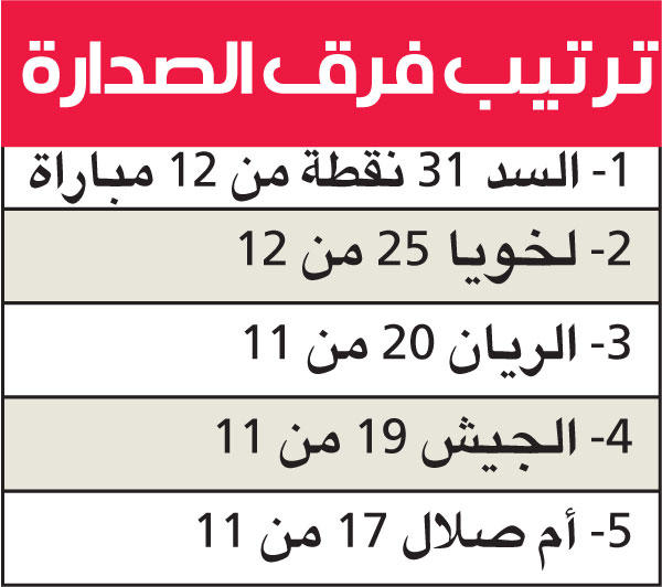ورفع العربي رصيده الى 11 نقطة بفوزه الثاني، لكنه ظل في المركز الحادي عشر قبل الأخير، بينما ظل السد في الصدارة برصيد 31 نقطة.وقدم العربي أفضل مبارياته على الإطلاق هذا الموسم واستحق الفوز بجدارة. وخلافاً لذلك، قدم السد أسوأ مبارياته ولم تفلح التغييرات التي أجراها مدربه المغربي حسين عموتا للافلات من الخسارة الأولى. وانتزع لخويا حامل اللقب أصعب فوز له هذا الموسم، وأفلت من مفاجأة كبيرة أمام السيلية صاحب المركز الأخير وهزمه 2-1 في الوقت بدل الضائع.وسجل للخويا سباستيان سوريا (75) منفرداً بصدارة الهدافين مع 9 أهداف، والسنغالي ايسار ديا (90+3) والبوركيني موموني داغانو هدف السيلية (83 من ركلة جزاء) رافعا رصيده إلى 8 أهداف في المركز الثاني لترتيب الهدافين.ورفع لخويا رصيده إلى 25 نقطة وثبت اقدامه في المركز الثاني وقلص الفارق بينه وبين السد الى 6 نقاط.وتعادل الخريطيات والخور بدون أهداف ورفع كل منهما رصيده إلى 11 نقطة وبقيا في المركزين التاسع والعاشر.(أ ف ب)