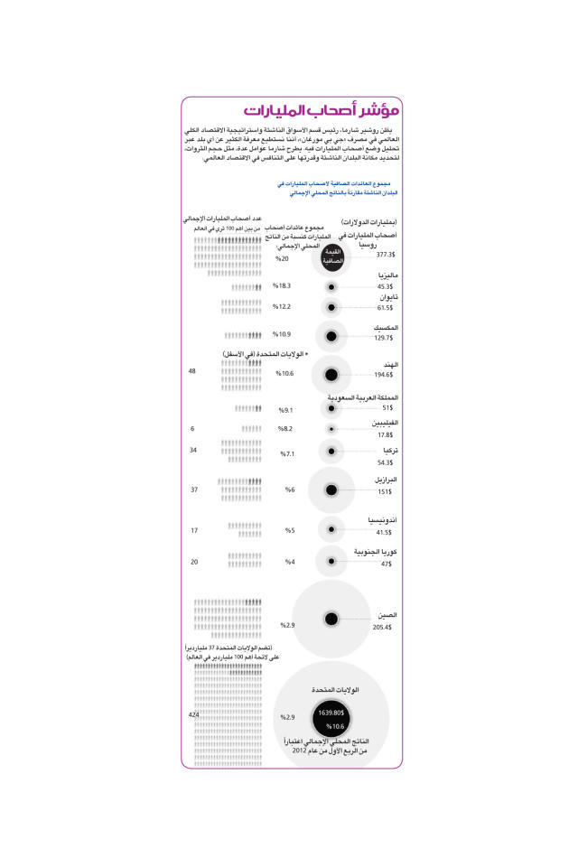 بعد عقدين تقريباً على الاستثمار في الأسواق الناشئة وتمضية معظم الوقت بالسفر من أزقة ولاية بيهار الرملية إلى سطح المدرجات في ساو باولو بحثاً عن الفرص المناسبة، استنتجتُ قاعدة غير مألوفة: يكفي أن نراقب التغيرات التي تطرأ على قائمة أصحاب المليارات، وأن نعرف الطريقة التي اعتمدوها لجني ملياراتهم، وأن نسجل عدد المليارات التي كسبوها. يمكن أن توفر التغييرات الواردة على تلك القائمة وحجم الثروات ومصدرها مؤشرات سريعة عن وضع البلدان الناشئة وقدرتها على المنافسة في الاقتصاد العالمي. إذا كان البلد ينتج عدداً مفرطاً من أصحاب المليارات مقارنةً بحجم الاقتصاد، يعني ذلك أن تركّز الثروات قد يؤدي إلى حالة من الركود. لنحلل وضع الصين مثلاً. يُنتج الاقتصاد السليم ثروة طائلة في بيئة تنافسية لكن لا يزال وضع الصين سليماً جداً نتيجةً لذلك. لوحظ ارتفاع عائدات أهم عشرة أشخاص من أصحاب المليارات، لكنّ قلة منهم جمعت ثروة تفوق عتبة العشرة مليارات دولار. من المبرر أن نظن إذاً أنّ بكين تطبق قانوناً غير مكتوب يحدد سقف الثروات الإجمالية. خلال السنوات الخمس عشرة الماضية، أنتجت الصين نسبة أكبر من الثروات الإجمالية مقارنةً بأي بلد آخر، لكن تبلغ ثروة أغنى رجل فيها حوالى 10 مليارات دولار، أي أقل بكثير مما يجنيه أصحاب المليارات في الأنظمة الاقتصادية الأصغر حجماً مثل الهند والمكسيك وروسيا ونيجيريا.