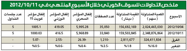 دبي... دعم عقاريواصل مؤشر سوق دبي المالي انطلاقته القوية التي بدأها منذ اكثر من ثلاثة اشهر مع بعض التصحيح، ليبلغ اعلى مستوياته منذ اكثر من 15 شهرا ورغم عمليات الضغط والبيع فإن النهاية كانت خضراء بـ8.77 نقاط تعادل نصف نقطة مئوية ليقفل عند مستوى 1636.12 نقطة وكانت الاسهم العقارية هي الداعم الاكبر للسوق حيث استمر النمو وسط تراجع مؤشرات الاسواق العالمية.وكان سوق الدوحة هو الثاني المقفل على اللون الاخضر ولكن بمكاسب اقل من سابقه ومحدودة لم تصل عشر نقطة مئوية ولم تتعد ربع نقطة فقط ليبقى عند مستواه السابق البالغ 8478.61 نقطة.خسارة كبيرة واجتاحت مؤشرات خمسة اسواق خسائر في بعضها كبيرة تجلت في مؤشر سوق ابوظبي الذي خسر 3.2 في المئة وتعادل 85.61 نقطة ليكسر مستوى 2600 نقطة التي تماسك عليها في اكثر من مناسبة وبعكس مؤشرات دبي السوق الاقرب له، ولكن انطلاقة ابوظبي كانت اسرع من دبي وقبله بأكثر من اسبوع وبالتالى التصحيح اصبح مستحقا خصوصا في ظل تراجع مؤشرات عالمية وأسعار النفط قبل تماسكها خلال جلسة الخميس الماضي.ولم يصمد السوق السعودي الاكبر عربيا عند مستوياته السابقة اذ استسلم لخسارة كبيرة خلال الاسبوع بلغت 90.3 نقطة تعادل نسبة 1.3 في المئة ليكسر مستوى 6800 نقطة مجددا ويقفل عند مستوى 6796.9 نقطة، وكان لتذبذب اسعار النفط اثر مباشر على تداولات "تاسي" كما ان انتظار نتائج الشركات السعودية التي انطلق بعضها في نهاية الاسبوع أثر بشكل مباشر على الاسهم ومؤشر السوق خلال الفترة القادمة.وأطاحت بسوق المنامة خسارة كبيرة خلال الاسبوع الماضي واستمر بالنزيف دون توقف متأثرا بما يحدث من احتجاجات مستمرة في المملكة الخليجية الصغيرة التي تصل بعض الفترات الى حد الصدام بين محتجين وقوات الشرطة، وبمثل هذه البيئة السياسية الخطرة لا غرابة في ان يفقد مؤشر السوق البحريني 1.1 في المئة تعادل 11.88 نقطة ليتراجع الى مستوى 1065.86 نقطة وهي ادنى مستوى له منذ سنوات.وخسر سوق مسقط ثلث نقطة مئوية فقط وتعادل نقطتين تقريبا ليقفل قريبا من مستواه السابق وهو من اعلى مستوياته خلال الاشهر الاربعة الماضية عند 5644.4 نقطة وكان تحت ضغط عمليات جني الارباح اضافة الى تراجع الاسواق العالمية وأسعار النفط.تراجع السوق الكويتيوسط اجواء سياسية غير مستقرة ومؤشرات متضخمة تحتاج تصحيحا وانتظارا لبيانات مالية للربع الثالث كانت حالة من الضغط على مؤشرات السوق الكويتي الثالث الرئيسية لتخسر جميعها، حيث فقد المؤشر السعري 4 اعشار نقطة مئوية تعادل 26.3 نقطة ليتخلى عن طموحاته باعتلاء مستوى 6 آلاف نقطة والذي اجتازه بأكثر من مناسبة قبل ان يعود ويستسلم مقفلا عند مستوى 5968.8 نقطة، بينما تماسك مؤشر كويت 15 عند مستوى الالف نقطة واقفل عنده بعد ان خسر نصف نقطة مئوية تعادل 5 نقاط، كما خسر المؤشر الوزني 6 اعشار ليقفل عند مستوى 416.5 نقطة.وعلى مستوى حركة التداولات كان الاستقرار اقرب لمؤشرات القيمة وعدد الصفقات بينما زاد النشاط بنسبة 16 في المئة وسط عمليات بيع على الاسهم النشطة في حين كانت السيولة على ارتفاع محدود بأقل من 2 في المئة وتراجعت الصفقات بنسبة 3.5 في المئة.
