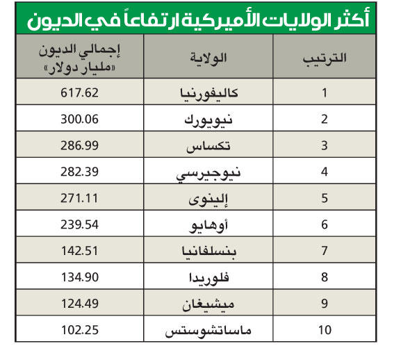 بينما يتابع العالم المحادثات الجارية بين الجمهوريين والديمقراطيين، التي يحاول من خلالها قادة أكبر حزبين في الولايات المتحدة تفادي منعطف "الهاوية المالية" مع أكبر قدر من المكاسب السياسية "إذا أمكن" تبدو مشكلة الدين مثاراً للقلق في ظل الحاجة إلى رفع سقفه مجدداً فوق 16 تريليون دولار.اجتمع الرئيس الأميركي باراك أوباما مع الزعيم الجمهوري جون بينر في البيت الأبيض مع تنامي الآمال في إمكانية تفادي زيادات ضريبية وتخفيضات في الإنفاق يمكن أن تدفع الاقتصاد الأميركي إلى الركود في العام المقبل.ويعد الاجتماع الذي استغرق 45 دقيقة علامة جديدة على أن المحادثات التي تهدف إلى تفادي "الهاوية المالية" ربما تحرز تقدما بعد أسابيع من الجمود. وقال مساعدون من كلا الحزبين الديمقراطي والجمهوري إنهم متفائلون بإمكانية التوصل إلى اتفاق في الأيام القادمة.وقال مساعد من الديمقراطيين: "نقترب من الاتفاق" غير أنه أضاف أن الاتفاق ليس وشيكا. ورغم أنه لاتزال هناك خلافات رئيسية بين الجانبين فإن المستثمرين ابتهجوا بعلامات التقدم. وسجل مؤشر ستاندرد آند بورز 500 للأسهم الأميركية امس أفضل أداء له منذ 23 نوفمبر.وذكر فرانك ديفيس مدير المبيعات والتداول لدى "إل إي كيه" للأوراق المالية: "يبدو أن هناك ملامح اتفاق بشأن الهاوية المالية". ورأى مساعدون لجون بينر رئيس مجلس النواب الاميركي ان أحدث عرض من البيت الابيض لتفادي "الهاوية المالية" غير متوازن لكنه يسير بالمفاوضات في اتجاه ايجابي.وقال بريندان باك وهو متحدث باسم بينر: "أي تحرك للابتعاد عن العروض غير الواقعية التي قدمها الرئيس في السابق هو خطوة في الاتجاه الصحيح، لكن اقتراحا يتضمن زيادة في الايرادات قدرها 1.3 تريليون دولار مقابل تخفيضات في الانفاق بقيمة 930 مليار دولار فقط لا يمكن اعتباره متوازنا."واضاف قائلا: "نأمل مواصلة المناقشات مع الرئيس حتى يمكننا الوصول الي اتفاق يكون متوازنا حقا ويبدأ حل مشكلتنا للانفاق."وبينما يتابع العالم المحادثات الجارية بين الجمهوريين والديمقراطيين، والتي يحاول من خلالها قادة أكبر حزبين في الولايات المتحدة تفادي منعطف "الهاوية المالية" مع أكبر قدر من المكاسب السياسية "اذا أمكن" تبدو مشكلة الدين مثاراً للقلق في ظل الحاجة إلى رفع سقفه مجددا فوق 16 تريليون دولار.وفي المقابل، فإن الحكومات المحلية للعديد من الولايات الأميركية تعاني مشاكل ومستويات مرتفعة من الديون، كما تعاني البلاد بشكل عام، وهي وتيرة تختلف من ولاية إلى أخرى.ويقدم الجدول التالي الولايات التي تعاني مشاكل كبرى مع ديونها المرتفعة في ظل تباطؤ النمو الاقتصادي وارتفاع معدل البطالة الذي يستهدف البنك الفيدرالي وصوله إلى 6.5% قبل أن يقرر رفع الفائدة من قرب مستوياتها الصفرية.(رويترز وأرقام)