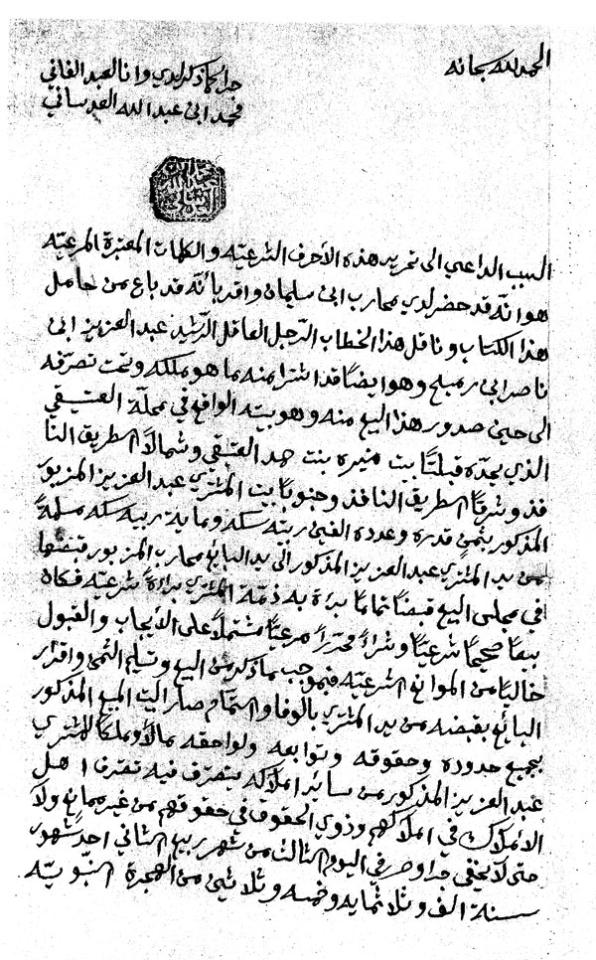 "الحمد لله سبحانه، جرا كما ذكر لدي وانا العبد الفاني محمد ابن عبدالله العدساني،،السبب الداعى الى تحرير هذه الأحرف الشرعية، والكلمات المعتبرة المرعية، هو انه قد حضر لدي محارب ابن سليمان، واقر بأنه قد باع من حامل هذا الكتاب، وناقل هذا الخطاب، الرجل العاقل الرشيد عبدالعزيز ابن ناصر ابن رميح، وهو أيضا قد اشترا منه ما هو ملكه وتحت تصرفه الى حين صدور هذا البيع منه، وهو بيته الواقع في محلة العتيقي، الذي يحده قبلتا بيت منيرة بنت حمد العتيقى، وشمالا الطريق النافذ، وشرقا الطريق النافذ، وجنوبا بيت المشتري عبدالعزيز المذكور، بثمن قدره وعدده ألفين روبيه سكة وماية روبية سكة، مسلمة من يد المشترى عبدالعزيز المذكور الى يد البايع محارب المزبور، قبضها في مجلس البيع قبضا تماما، برئت به ذمة المشترى براءة شرعية، فكان بيعا صحيحا شرعيا، وشراء محررا مرعيا، مشتملا على الإيجاب والقبول، خاليا من الموانع الشرعية، فبموجب ما ذكر من البيع وتسليم الثمن وإقرار البايع بقبضه من يد المشترى بالوفاء والتمام، صار البيت المبيع المذكور بجميع حدوده، وحقوقه، وتوابعه، ولواحقه، مالا وملكا للمشترى عبدالعزيز المذكور من ساير أملاكه، يتصرف فيه تصرف أهل الأملاك في أملاكهم، وذوى الحقوق في حقوقهم، من غير ممانع ولا... . حتى لا يخفى، جرا وحرر في اليوم الثالث من شهر ربيع الثاني، احد شهور سنة ألف وثلاثماية وخمسة وثلاثين من الهجرة النبوية".