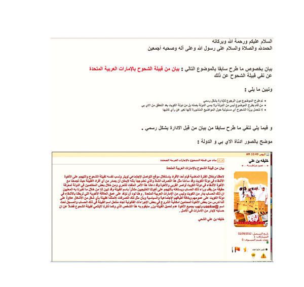 يبدو أن رقعة الكويت لم تعد تكفي لحجم مشاكلها السياسية، فأصبح تصديرها إلى الخارج عبر "تويتر" والمواقع الإلكترونية توجهاً جديداً في إطار "الصراع الإلكتروني" بين أنصار الأغلبية ومعارضيها! فخلال الفترة الماضية، ظهر حساب على "تويتر" لشخص اسمه زايد الشحي، عرف نفسه بأنه من دولة الإمارات الشقيقة، وكانت مجمل تغريداته تطالب النائبين د. جمعان الحربش ود. فيصل المسلم بمناظرته. وقال هذا الشخص، في بيان له على موقع القبيلة، إنه يملك تسجيلات صوتية تدين النائبين وتكشف ما يسعيان إليه من قلب نظام الحكم في الكويت، ولم يكتف بطلب المناظرة بل استمر في انتقاد الحربش والمسلم بشكل متواصل لعلاقتهما بالإخوان المسلمين وما يحدث في الإمارات. في المقابل، نُشِر بيان آخر، صباح أمس، على منتدى قبيلة الشحوح الإماراتية (التي ينتمي إليها الشحي) جاء فيه أن المذكور لا علاقة له بالقبيلة، كما أنه "ليس من دولة الإمارات ولا يمت إلى الدولة بصلة"، وأنه استغل اسم القبيلة للهجوم على الأشقاء في الكويت، مضيفاً أنه "بعد تتبع رقم (الآي بي) الخاص به اتضح أن الشخص الذي كتب البيان على موقع القبيلة مصدره الكويت". وتعليقاً على البيان، الذي تناقله أنصار النائبين المسلم والحربش، وبعض الخدمات الإخبارية في "تويتر" وعبر الرسائل القصيرة "SMS"، قال الحربش: "نعلم جميعاً حجم حملة التزوير والكذب التي نتعرض لها، والتي لن تنتهي فصولها مادمنا ثابتين على مواقفنا"، مشيراً إلى "نفي قبيلة الشحوح في الإمارات أن يكون المدعي زايد الشحي من أبنائها"، فضلاً عما ذكرته القبيلة من أن "هذا الحساب مزور ويدار من الكويت". وتناقل معارضو الحربش والمسلم البيان الأول المنسوب إلى القبيلة (الذي أصدره الشحي) موجهين أصابع الاتهام إلى أنصارهما بتلفيق البيان الثاني، ونسبته إلى قبيلة الشحوح... وهكذا انتقل الصراع المحلي من الكويت إلى الإمارات.. وقبائلها الكريمة.
