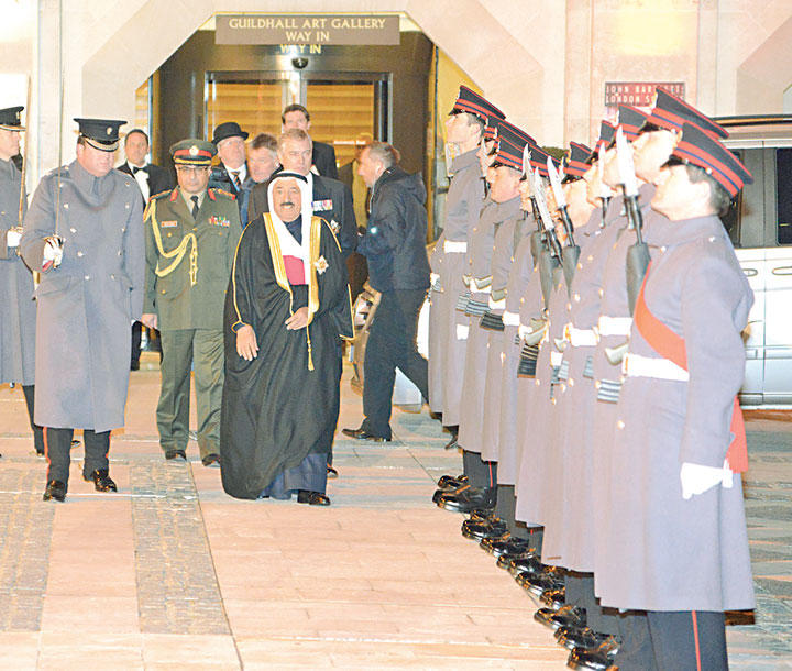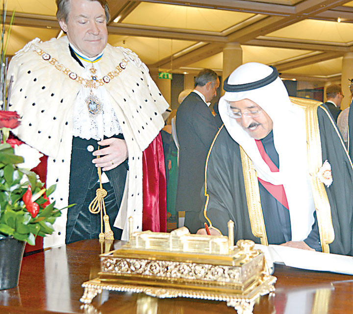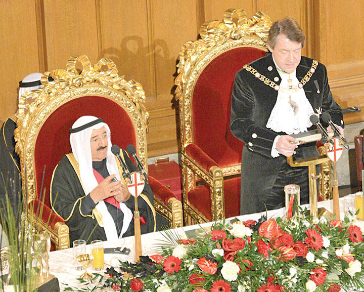 وأضاف "ان جذور شراكتنا الاقتصادية والتجارية تعود الى القرن الثامن عشر عندما كنا نستورد الزعفران والحرير والتوابل من خلال الكويت كمركز تجاري رئيسي. وللكويت وبريطانيا العديد من الصفات المشتركة فكلاهما بلدان صغيران بحثا خارج حدودهما عن تحقيق التنمية التي تعتمد على التجارة ولدى البلدان تاريخ بحري... الكويت كبوابة للخليج ولندن كبوابة لأوروبا".وتابع "اليوم لدى كلا البلدين ديناميكية في القطاع الخاص مع التركيز على الخبرة المالية وكلاهما يقومان على أسس ترسيخ الديمقراطية.في زمننا الحاضر لعبت الكويت دورا كبيرا في حياة وعمل مدينة لندن لاسيما مع اختياركم انشاء مكتب الاستثمار الكويتي هنا منذ ستين عاما واستثماركم على المدى الطويل في لندن والمملكة المتحدة - بل في العالم من خلال لندن وليس آخرا من خلال حيازتكم للممتلكات الخاصة وتشييده على الشارع التاريخي في مدينة لندن (شيبسايد)".وقال غيفورد "قد أسعدني سماعي اليوم أنكم ستزيدون من حجم اعمالكم من خلال مكتب الاستثمار الكويتي بلندن في السنوات المقبلة خصوصا في البنية التحتية. لذلك نحن نتطلع الى لعب دورنا في دعمكم وانتم تواصلون تنويع استثماراتكم واقتصادكم وتمضون قدما في خطط تحويل البنية التحتية لبلدكم وهي رؤية لدينا المهارات والخبرات لدعمها".وأضاف "كما لدينا شراكة ثقافية مع مهندسين معماريين وشركات بريطانية تعمل معكم على المباني الكبيرة والمشاريع مثل الرؤية الخيالية لمركز ثقافي كبير في مدينة صباح الأحمد والذي يعكس صدى البحرية الكويتية وتاريخها التجاري ويعزز فكرة وجود أمة تغذي شعبها. ولدينا ايضا شراكة سياسية حيث وقفت المملكة المتحدة الى جانبكم عندما كانت سيادة الكويت تحت التهديد، وهي لا تزال تقف في صدارة ضمان أمن الكويت وشعبها. ان الصداقة بين المملكة المتحدة والكويت هي ذات مكانة خاصة حقا... وقد حققت قدرا كبيرا ويمكنها أن تحقق أكثر من ذلك".هدية قيمةوبعد عزف النشيد الوطني الكويتي القى صاحب السمو كلمة هذا نصها: "معالي الصديق العزيز اللورد روجر غيفورد - عمدة مدينة لندن صاحب السمو الملكي دوق يورك سعادة البارونة دي سوزا - رئيس مجلس اللوردات اصحاب السعادة أيها السيدات والسادة بادئ ذي بدء أتقدم لكم وللشعب البريطاني الصديق بجزيل الشكر والامتنان على ما حظينا به من حسن استقبال وكرم ضيافة.كما أتقدم بالشكر والتقدير لسعادة القاضي بيتر بيومونت على هديته القيمة والتي ستكون بمثابة ذكرى مميزة لزيارتي الى المملكة المتحدة والى العاصمة لندن بشكل خاص.ان مدينة لندن تعد من أعظم مدن العالم بمبانيها وحدائقها وساحاتها التاريخية الجميلة والتي تروي حكاية مدينة تعود الى 2000 سنة وفي قلب تلك القصة يقع (سكوير مايل) والذي يساهم في جعل مدينة لندن منبعا لحيوية البلاد وقوتها الاقتصادية.كما أنها تعد من أكثر المدن التي يقصدها الزوار من مختلف بقاع العالم وبالأخص شعب بلدي الكويت الذي اعتاد على زيارة هذه المدينة الرائعة منذ عقود طويلة لما تتمتع به من مقومات أساسية وبنية تحتية مؤهلة لتقديم ما يحتاجه الزائر من خدمات وتسهيلات مهما كان هدفهم سواء السياحة أو التعليم أو الرعاية الطبية.لقد جمعت مدينتكم الرائعة بين عراقة الماضي وابهار الحاضر فبالاضافة الى كونها أحد أهم مراكز المال والأعمال في العالم فهي تحتوي على معالم أثرية عريقة ومنتجعات سياحية رائعة وخبرات طبية متقدمة ومؤسسات علمية رائدة تحظى بمكانة وسمعة دولية مرموقة. لقد أبهرتني بل وأبهرت العالم أجمع الامكانيات الضخمة التي قدمها بلدكم الصديق وكانت سببا في انجاح دورة الألعاب الأولمبية في صيف 2012 والتي تابعتها باعجاب ولا يفوتني أن أتقدم لكم بخالص التهنئة على نجاح هذه الدورة وعلى ما حققه أبطالكم الرياضيون من نتائج حيث حصدوا العديد من الميداليات محققين بذلك رقما قياسيا من النجاح.ان النجاح في تنظيم هذه الدورة والحصول على مراكز متقدمة بين جميع الفرق لم يأت من فراغ فهو نتاج خبراتكم العريقة في مختلف المجالات وعزي