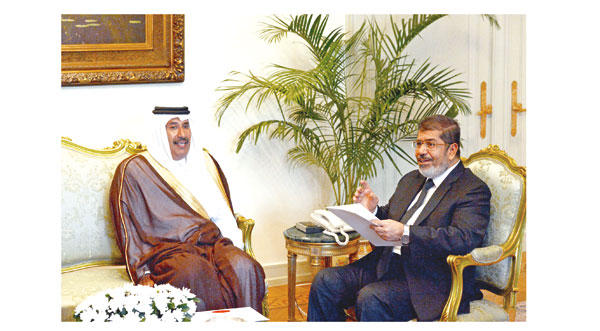 استقبل الرئيس محمد مرسي أمس رئيس الوزراء القطري وزير الخارجية الشيخ حمد بن جاسم آل ثاني، الذي يزور مصر حالياً. وتناول اللقاء، بحث سبل دعم العلاقات الثنائية بين البلدين، خاصة ما يتعلق بتوسيع التعاون الاقتصادي وزيادة الاستثمارات القطرية في السوق المصري. كما تناولت المباحثات آخر التطورات الجارية على الساحة العربية خاصة ما يتعلق بجهود التوصل إلى حل سياسي للأزمة السورية لوقف نزيف دماء الشعب السوري بعيداً عن التدخل الأجنبي. وفي الصورة مرسي مستقبلاً بن جاسم في القصر الرئاسي أمس. (الجريدة)