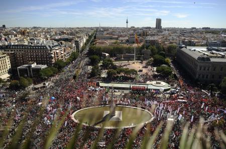 تدفق حشد هائل من المتظاهرين من جميع انحاء البلاد، الى وسط مدريد اليوم السبت للتعبير عن احتجاجهم على الاجراءات التقشفية التي فرضتها الحكومة بينما تحاول البلاد تصحيح حساباتها لتجنب خطة انقاذ شاملة.