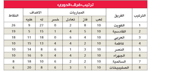 استحق الكويت التربع على قمة الدوري الممتاز لكرة القدم برصيد 27 نقطة، ونجح الفريق في الابتعاد بالقمة عن أقرب منافسيه (القادسية والعربي) بفوزه في الجولة العاشرة على الجهراء، وتعادل الأصفر والأخضر في لقاء الديربي.