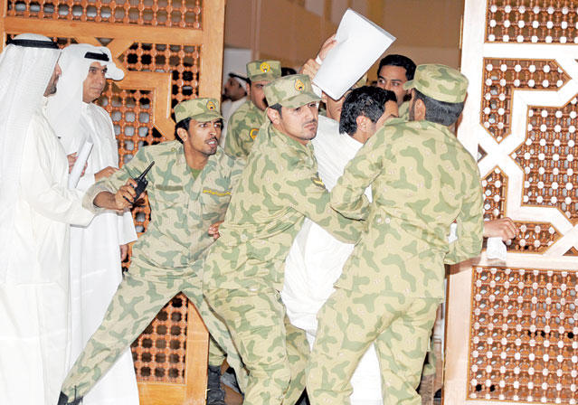 حدثت مشاجرة عنيفة بين سكرتير النائب محمد الخليفة وسكرتير أحد الوزراء وأفراد من حرس المجلس، اثر منع النائب محمد الخليفة من الدخول على الوزراء المجتمعين في اجتماع مغلق في الاستراحة بعد رفع الجلسة نهائياً.وكانت شرارة البداية عندما منع سكرتير الوزير النائب الخليفة من الدخول على الوزراء في استراحة الوزراء، لكن الخليفة أصر على الدخول قائلاً: "منو أنت اللي تمنعي؟ أنا نائب ومو جايكم الوزارة أنتم جايين عندنا في المجلس". ومع اصرار الأول على عدم السماح له بالدخول حدث احتكاك بينه وبين النائب، وصل إلى أن أمسك سكرتير الوزير ثوب النائب الخليفة، ما دفع سكرتير الاخير وهو ابن اخيه الى ان يشتبك مع سكرتير الوزير وتبادلا الضرب ثم دخل الى مساندتهم سكرتير النائب د. خالد شخير، ما حدا بحرس المجلس الى التدخل، لكن بدلا من ان توفير الحماية دخل طرفا في المشاجرة فقام بضرب سكرتير الخليفة وسحبه إلى خارج المجلس عند المدخل الرئيسي وهو يصرخ قائلاً: "هذا عمي" ، ولم ينته الموقف عند ذلك بل قام أحد المتورطين في الشجار من افراد الحرس باللحاق به الى الخارج وكأنه يريد أن يشفي غليله، ولكن زملاءه حالوا دون ذلك بعد أن استطاعوا أن يحكموا عليه قبضتهم والعودة به إلى داخل المجلس.وتوضيحاً منه للموقف، ابدى النائب محمد الخليفة استغرابه مما حدث اليوم في مبنى مجلس الامة عندما تم التهجم عليه بصورة تثير الشكوك والريبة حول الهدف الحقيقي من خلق مثل هذه الاجواء في ظل ما تعيشه السلطتان من أزمة سياسية.وقال الخليفة في تصريح صحافي ان عناصر الامن المرافقين للوزراء تهجموا عليه ومنعوه من دخول مرفق من مرافق مجلس الامة وهو قاعة استراحة الوزراء التي كان رئيس الحكومة نفسه اصدر أوامر للأمن الخاص بالوزراء بعدم منع النواب من دخولها، مؤكداً أن قيام الأمن الخاص بالوزراء باستفزازهم غير المبرر والتهجم عليه والتصرف بطريقه فجة ومتعمدة هي تصرفات تثير الاستغراب وهدفها خلق حالة من التوتر والاحتقان السياسي.وابدى استغرابه من تصرف قائد حرس المجلس العميد بسام الرفاعي ودفاعه المستميت عن بعض افراد الحرس الوطني من (المنتدبين) للمجلس الذين اعتدوا على احد موظفي مجلس الامة اثناء تهجم عناصر امن الوزراء عليه، مؤكداً أن العميد الرفاعي لم يكن موجودا لحظة الحادث ولم يشاهد ما حدث.