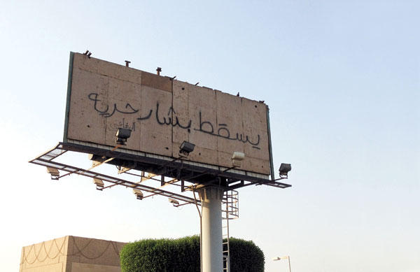 بحّت حنجرة "الرفاعي" من هتافات الحرية والابتهال بسقوط النظام السوري ورمزه بشار الأسد، فاختار لوحة إعلانية على شارع الخليج مقابل الدائري الثاني ملاذاً لآماله، التي استقطبت عابري "الخليج" قبل أن تعمد الجهات البلدية إلى إزالة الشعار من دون أن يخمد ذلك أمل الرفاعي في "الحرية... وسقوط بشار".