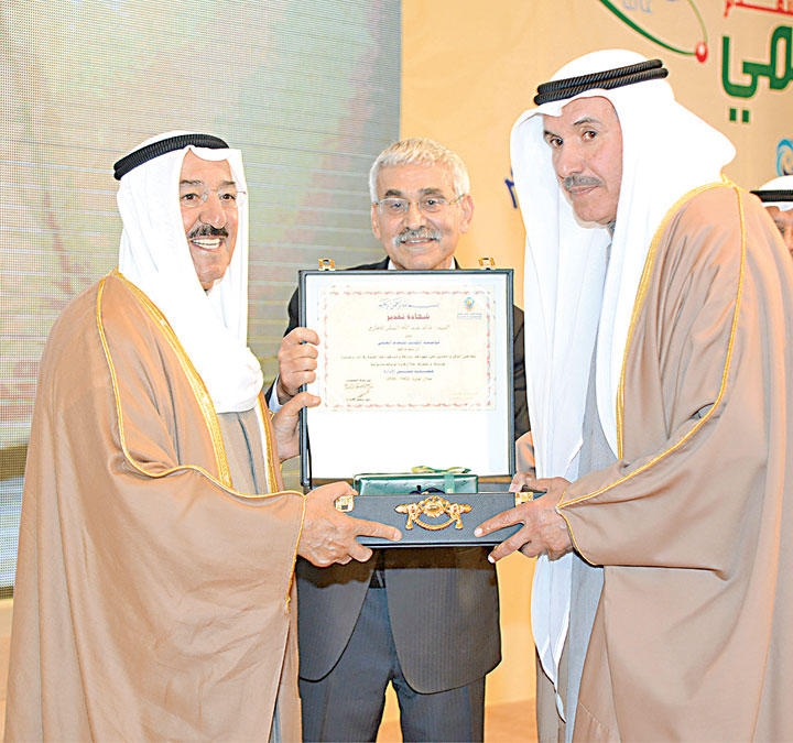 رعى سمو الأمير حفل توزيع الجوائز وشهادات التقدير على الفائزين بجوائز مؤسسة الكويت للتقدم العلمي بحضور حشد من الشيوخ والمسؤولين الرسميين.