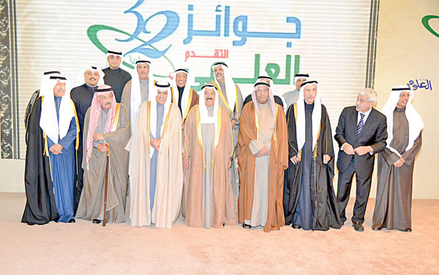 وشهد الحفل سمو ولي العهد الشيخ نواف الاحمد ورئيس مجلس الامة علي الراشد ورئيس مجلس الامة السابق جاسم الخرافي وكبار الشيوخ ونائب رئيس الحرس الوطني الشيخ مشعل الاحمد ورئيس مجلس الوزراء سمو الشيخ جابر المبارك والنائب الاول لرئيس مجلس الوزراء وزير الداخلية الشيخ احمد الحمود ونائب وزير شؤون الديوان الاميري الشيخ علي الجراح وكبار المسؤولين بالدولة.هدى الدستوروبدأ الحفل بالنشيد الوطني وتلاوة ايات من الذكر الحكيم بعدها ألقى شهاب الدين كلمة اشار فيها الى المناسبة السنوية "لتكريم كوكبة جديدة من العلماء والباحثين الكويتيين والعرب فخورين بانجازاتهم العلمية المتميزة وفرحين لهم".وأضاف "يتزامن حفلنا هذا العام مع احتفالات الكويت بالذكرى الخمسين للمصادقة على الدستور الذي التف حوله الكويتيون بجميع اطيافهم وتمسكوا به حافظا لاستقلالنا ونبراسا نهتدي به في تنظيم وادارة شؤون الدولة الحديثة واساسا لازدهارها بقيادة امير البلاد ودرعها الحامي من الانواء التي تعصف من حولنا".وقال "لقد نص الدستور على ان التعليم ركن اساسي لتقدم المجتمع تكفله الدولة وترعاه كما ترعى العلوم والاداب والفنون وتشجيع البحث العلمي ونص كذلك على ان البحث العلمي والتعبير عن الراي حقوق مكفولة في اطار ما ينظمه القانون وما من شك فان الايمان الراسخ باهمية التعليم والبحث العلمي والدعم المجتمعي السخي لهما هما ما حققا للكويت الريادة في التنمية والازدهار في النصف الثاني من القرن الماضي وهما سبيلنا لمواصلة سباق التنمية في القرن الحادي والعشرين لننعم نحن والاجيال القادمة بالخيرات التي حبانا الله بها".تكاتف ومبادراتواشار الى ان "اهل الكويت جبلوا على اختيار التعاون والتكاتف منهجا للعمل في جميع مناحي حياتهم واولوا العلم والمعرفة منزلة رفيعة وما انشاء المدرسة المباركية بمبادرة من القطاع الخاص قبل نحو مئة عام الا دليل ناصع على التعاون البناء والشراكة الفاعلة بين المواطنين والحكومة قبيل حقبة الوفرة النفطية. كما ان مؤسسة الكويت للتقدم العلمي دليل ناصع اخر على تواصل هذه الشراكة حين تلاقت رؤية المغفور له امير الكويت الراحل الشيخ جابر الاحمد مع مبادرة من قيادات القطاع الخاص متمثلة بغرفة تجارة وصناعة الكويت فاثمرت انشاء هذه المؤسسة الفريدة والرائدة التي تسعى دوما الى النهوض بادائها لتعظيم الفائدة المرجوة من دورها الطليعي. توجيهات ساميةوقال شهاب الدين انه بتوجيه من امير البلاد ورئيس مجلس ادارتها استكملت المؤسسة مع نهاية عام 2011 وضع خطة استراتيجية للاعوام الخمسة القادمة وباشرت بتنفيذها مع مطلع عام 2012 والخطة تستهدف تمكين المؤسسة من تحقيق رؤيتها ورسالتها مسترشدة برؤية واضحة لمستقبل العلوم في الكويت ولدور المؤسسة المساند والمكمل لدور الحكومة ومؤسساتها. وأضاف ان احد منجزات العام الجدير بالذكر هو ما حققه مركز صباح الاحمد للموهبة والابداع التابع للمؤسسة بالتعاون مع وزارة التربية في تشغيل فصول الموهبة للطلبة المتميزين في بعض المدارس، كما بادرت المؤسسة في هذا العام الى رعاية مقترح لانشاء جامعة افتراضية (جامعة الكويت الافتراضية) يمكنها ان تقدم خدمات تعليمية مستقبلا لعشرات الالاف من ابناء الكويت والملايين من ابناء الدول العربية الذين تحول الطاقة الاستيعابية لمؤسسات التعليم العالي او ظروفهم الاجتماعية دون استكمال دراستهم الجامعية ويجري حاليا استكمال دراسات الجدوى الاقتصادية والفنية لهذا المشروع الحيوي بالتعاون مع جامعة الكويت.وقال انه في اطار المحور الاستراتيجي الذي يهدف الى تحفيز وتطوير القدرات العلمية والتكنولوجية للقطاع الخاص والمشاركة في بناء اقتصاد قائم على المعرفة وافق مجلس الادارة مؤخرا على تقديم دعم سنوي لمركز عبدالعزيز الصقر للتدريب التابع لغرفة تجارة وصناعة الكويت بهدف تاهيل الشباب الكويتي لخوض مجالات الاعمال الحرة. كما عقدت ادارة المؤسسة لقاءات موسعة مع قيادات كبرى شركات القطاع الخاص والاتح