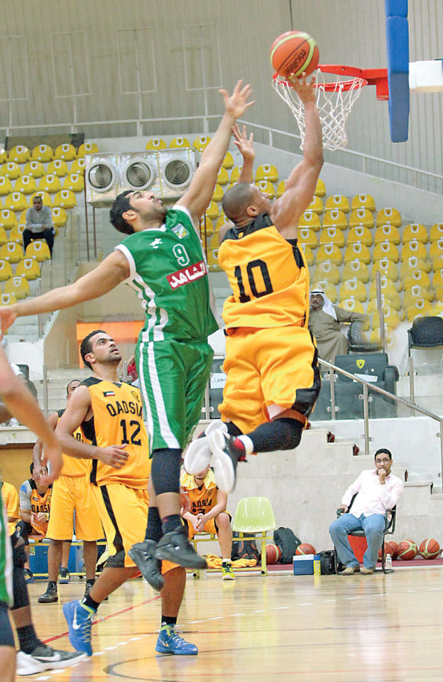 وقد جاءت مباراة القادسية والعربي مثيرة منذ البداية استطاع بها الأخضر التقدم 10-3 في الدقيقة الثالثة بعد أن سجل فهد الرباح والبوسني هارس ثلاثيتين مستفيدين من طريقة دفاع القادسية الزون، لينتفض بعد ذلك مدرب الاصفر البوسني منصور بايراموفيتش بطلب وقت مستقطع وحول دفاعه الى رجل لرجل الذي حدّ به كثيراً من خطورة لاعبي العربي، وحقق أول تقدم 14-13، حتى أنهى الربع الأول لمصلحته 22-19.تبادل الفريقان التسجيل والتقدم في الربع الثاني وعاب فريق العربي الدفاع الضعيف وهجومه غير المنظم، لينتهي الربع الثاني بتقدم القادسية 43-37.وفي الربع الثالث ابتعد القادسية بالفارق الى عشر نقاط الا أن ارتكاب قائده فهاد السبيعي خطأ فنيا "تكنكال فاول" أعاد الاخضر للمنافسة مرة اخرى ليقلص الفارق عند النتيجة 56-54. وبدا واضحا فارق اللياقة بين لاعبي الفريقين في الربع الرابع الذي رجح كفة الاصفر، وسجل لاعبه عبدالله الصراف 22 نقطة لينتهي اللقاء بنتيجة 76-64،أدار اللقاء الحكام أحمد العصفور وسالم الهزاع وحافظ الحلبي.الكويت وكاظمة لفض الشراكة وتختتم مساء اليوم منافسات القسم الاول بمباراتين، حيث يلتقي النصر مع العربي في الساعة الخامسة على صالة كاظمة. ويستضيف كاظمة الكويت في الساعة السابعة، وسيكون هذا اللقاء اكثر اهمية لفض شراكة الفريقين في صدارة القسم الأول.