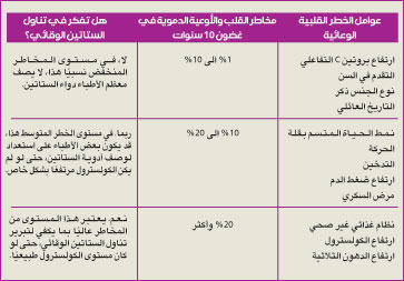 يقول: «بعد تجارب سريرية عشوائية متعددة تبين أن تناول الستاتين قد يقلل من خطر الإصابة بأزمات قلبية وسكتات دماغية بنسبة 25 إلى 50 في المئة، حتى بين الأفراد الذين يتمتعون بمستويات طبيعية أو منخفضة من الكولسترول. على الأشخاص الذين يواجهون احتمال إصابتهم بأمراض القلب التحدث مع الطبيب حول ما إذا كان ينبغي تناول هذه العقاقير، ليس كبديل لنظام غذائي صحي وممارسة الرياضة والإقلاع عن التدخين، لكن كعلاج وقائي إضافي».ما يقوله العلماستنتجت دراسة، نشرت في مجلة «لانسيت» وشملت 174 ألف شخص، أن الأشخاص الذين تناولوا الستاتين وخفضوا الكولسترول بنسبة 40 ملغ لكل ديسيلتر (ملغم / دل) خفضوا مخاطر الإصابة بأمراض القلب والأوعية الدموية (نوبات قلبية غير مميتة وسكتات دماغية) بنسبة 20 في المئة على مدى خمس سنوات، أي 11 نوبة قلبية أقل لكل ألف شخص. قد تبدو هذه الاستفادة متواضعة، لكن، بحسب الدكتور ردكير، «نحتاج إلى الحدّ من المخاطر الكبيرة على مدى أكثر من 20 عامًا لنكون صادقين مع مرضانا».فوائدوفق الدراسة، شعر الأشخاص على نحو أفضل حتى لو كانوا معرضين لخطر منخفض نسبيًا بالإصابة بأمراض القلب والشرايين. لماذا؟ يلمح اختبار «جوبيتر» الذي أجري في عام 2008 إلى الإجابة.مبررات استخدام الستاتين في الوقاية الأولية: في اختبار تقييم للروزيوفاستاتين أعطى الباحثون الستاتين إلى أشخاص يتمتعون بمستويات عادية أو منخفضة من الكولسترول وبمستويات عالية من البروتين التفاعلي C، الذي يؤشر إلى التهاب في الدم، ويُعتقد أنه يؤدي دورًا رئيسًا في أمراض القلب والأوعية الدموية.على سبيل المثال، خفض الروزيوفاستاتين خطر حدوث أول نوبة قلبية أو سكتة دماغية بنسبة 50 في المئة وخطر الموت بنسبة 20 في المئة. يقول الدكتور ردكير: «يبدو أن الستاتين سيف ذو حدين، فهو يخفض نسبة الكولسترول ويمنع التهاب الأوعية الدموية، وكلاهما يحددان تطوير النوبات القلبية والسكتة الدماغية».لا يمكن للعلماء التمييز بين ما إذا كانت فوائد العلاج بالستاتين ناتجة من خفض الكولسترول أو لخفض الكولسترول وقمع الالتهاب على حد سواء. ويلاحظ الدكتور ردكير: «خمسون في المئة من النوبات القلبية والسكتات الدماغية تحدث لدى أشخاص يتمتعون بمستويات متوسطة أو طبيعية إلى منخفضة من الكولسترول. يبقى الكولسترول في غاية الأهمية، لكن لا يمكن أن يشكل الطريقة الوحيدة التي يمكننا التفكير فيها بهذا المرض».هل يناسبك الستاتين الوقائي؟ قد ينقذ الستاتين حياتك إذا تم تشخيص أمراض القلب والشرايين لديك، أو كنت تعاني مرض الأوعية الدموية الطرفية، أو خضعت لمجازة الشريان التاجي أو تعاني داء السكري.يُنصح الأشخاص الذين يعانون هذه الأمراض بالبدء بتناول الستاتين ما لم يمنعهم سبب طبي واضح من ذلك. أما بالنسبة إلى الناس عموماً، فثمة مبادئ توجيهية مقبولة رغم أنها قد تتغير مع ظهور معطيات التجارب السريرية في المستقبل القريب.يؤيد ردكير اتباع مبدأ توجيهي بسيط لوصف العقاقير الوقائية المخفضة للكولسترول. في حال تجاوزت الخمسين عامًا وتعاني مستويات عالية من الكولسترول الضار، ومستويات منخفضة من الكولسترول المفيد أو كانت نسبة البروتين التفاعلي C لديك مرتفعة، تظهر التجارب السريرية أن عقاقير الستاتين تقدم فائدة واضحة، لذلك لا تتردد في مناقشة هذه الأدوية مع الطبيب. مجددًا، يجب ألا تحل عقاقير الستاتين محل ممارسة الرياضة واتباع نظام غذائي صحي، مع أن أطباء كثرًا يلجأون إلى الستاتين بعد فشل تغيير نمط الحياة.كشف عن المخاطريقوم قرار تناول الستاتين الوقائي على تقدير المخاطر التي قد يتعرض لها الشخص بسبب إصابته بأزمة قلبية على مدى العقد المقبل، وعلى أساس الخصائص الشخصية والتاريخ الصحي. إذا كان الخطر يساوي 1 في المئة، يعني أن شخصاً من بين 100 شخص يعانون مستوى المخاطر نفسه سيصاب بنوبة قلبية أو يموت خلال 10 سنوات لاحقة. لا أحد يصف أدوية الستاتين لشخص مماثل.مع ذلك، إذا كان الخطر يناهز 10 في المئة أو أعلى، يفكر الأطباء بجدية في و