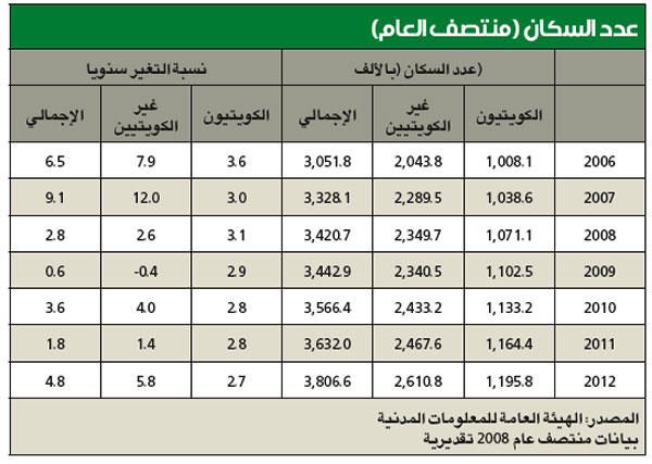 قال تقرير للبنك الوطني عن السكان والقوى العاملة في الكويت إن إجمالي القوى العاملة في الكويت نما في الأشهر الــ12 المنتهية في يونيو 2012 بنسبة %6، مقارنة بالسنة السابقة ليبلغ 2.26 مليون عامل، وقد ارتفع عدد العمالة الوافدة في كل من القطاعين العام والخاص والعمالة المنزلية.وأوضح التقرير أن عدد الموظفين الكويتيين ارتفع بأكثر من 14,300 خلال هذه الفترة، مقارنة بارتفاع بلغ 19,900 في السنة السابقة، أي بتراجع نسبته 28%، واستوعب القطاع العام 76% من الوظائف الجديدة، بينما استوعب القطاع الخاص النسبة الباقية البالغة 24%. وانخفضت نسبة الوظائف الجديدة في القطاع الخاص بنسبة %34 عن السنة السابقة. وكان رفع الرواتب هو على الأرجح السبب الذي شجع على الأداء القوي لتوظيف الكويتيين في القطاع العام الذي تمكن من استقطاب بعض الموظفين من القطاع الخاص.وأضاف تقرير "الوطني" أن عدد الوظائف الجديدة للكويتيين في القطاع الخاص بلغ خلال الأشهر الاثني عشر المنتهية في يونيو 2012، نحو 3,500 فقط مقارنة بـ 5,300 في السنة السابقة. واستحوذت المرأة على %65 من الوظائف الجديدة، إذ ارتفعت نسبة الكويتيات في القطاع الخاص من 27% إلى 51% في خلال السنوات العشر الماضية، وقد سجّل معظم هذا الارتفاع في السنوات الست الأخيرة. وارتفع إجمالي عدد الكويتيين العاملين في القطاع الخاص إلى 81,200، يشكلون ما نسبته %21 من إجمالي القوى العاملة الكويتية. وبين التقرير ارتفاع حجم القوى العاملة الوافدة (باستثناء العمالة المنزلية) في الأشهر الاثني عشر حتى نهاية يونيو الماضي بواقع 68 ألفا. وكان عدد غير الكويتيين الذين تم توظيفهم في القطاع العام 6,000 فقط، مقارنة مع 62,000 في القطاع الخاص.• كانت معظم الوظائف الجديدة التي شغلها الوافدون (باستثناء العمالة المنزلية) خلال هذه الفترة في قطاع الخدمات الشخصية والاجتماعية (63%) وقطاع الإنشاءات (16%) وقطاع مبيعات الجملة والتجزئة (12%). وتستقطب هذه القطاعات مجتمعة 43% من إجمالي عدد الموظفين الوافدين. وفي الوقت ذاته، ارتفع حجم العمالة المنزلية بمقدار 49,600 في الفترة ذاتها.• وبلغ إجمالي عدد سكان الكويت 3.8 ملايين في نهاية يونيو 2012، وذلك حسب الأرقام الصادرة عن الهيئة العامة للمعلومات المدنية، وهو ما يشكل نموا بواقع 4.8% على أساس سنوي، وبلغ عدد المواطنين الكويتيين نحو 1.19 مليون، أي ما نسبته 31% من إجمالي عدد السكان. وبلغت وتيرة النمو السكاني بين الكويتيين 2.7%، أي أقل بقليل من السنوات الأخيرة الماضية، حيث بلغ معدل نمو السكان الكويتيين 2.9% في السنوات الخمس السابقة.• وشكّل عدد السكان الوافدين 69% من إجمالي عدد السكان في الكويت بنهاية النصف الأول من عام 2012. وبلغ معدل نمو إجمالي عدد السكان بين الوافدين 5.8% على أساس سنوي، حيث ازداد عدد الوافدين بمقدار 96,700 في النصف الأول من العام 2012، وبمقدار 143,000 تقريبا في اثني عشر شهرا، أي أن معظم الزيادة حصلت في الأشهر الستة الأخيرة، ما يعكس بعض الانتعاش في النشاط الاقتصادي.• بلغ عدد سكان الكويت الراشدين– 20 سنة وما فوق– 2.8 مليون، يشكلون 73% من إجمالي عدد السكان. وينتمي السكان الكويتيون بالطبع إلى شريحة عمرية أصغر بكثير، إذ يبلغ عدد الكويتيين الراشدين 617,000، أي 22% فقط من مجموع عدد السكان الراشدين في الكويت، بينما يبلغ عدد الوافدين الراشدين 2.2 مليون.