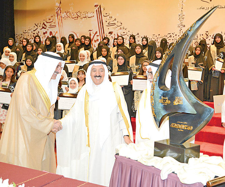 تحت رعاية وحضور سمو امير البلاد الشيخ صباح الاحمد اقيم صباح امس الحفل الختامي لتكريم الفائزين والفائزات في مسابقة الكويت الكبرى لحفظ القرآن الكريم وتجويده السادسة عشرة وذلك على مسرح قصر بيان.واستقبل سموه في مكان الحفل من قبل كل من وزير النفط وزير الاوقاف والشؤون الاسلامية بالوكالة هاني حسين والامين العام للامانة العامة للاوقاف الدكتور عبدالمحسن الخرافي واعضاء اللجنة الدائمة لمسابقة الكويت الكبرى لحفظ القرآن الكريم وتجويده.