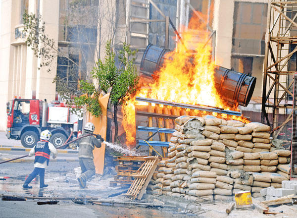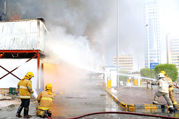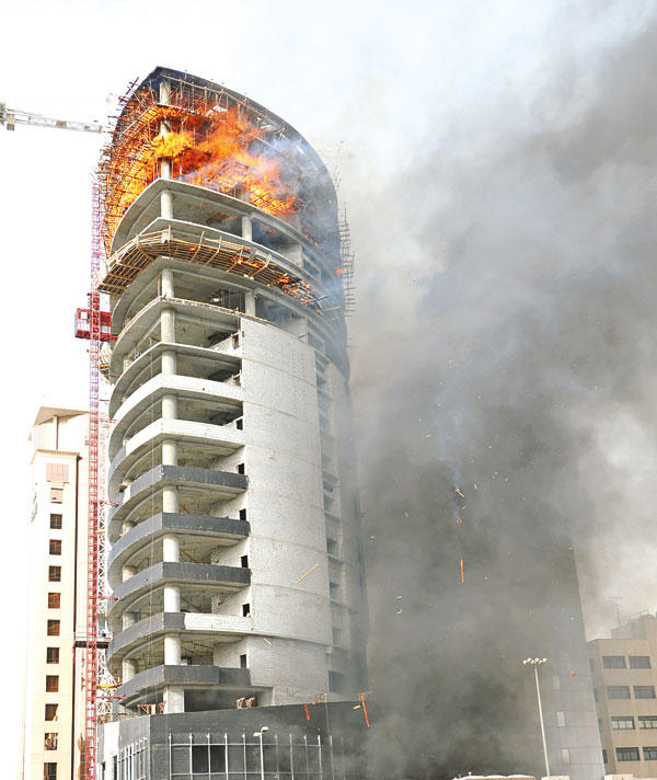 نشب في بناية قيد الإنشاء وامتد إلى ثلاث بنايات مجاورةشهدت منطقة العاصمة مساء أمس حريقاً في بناية قيد الإنشاء مكونة من 19 طابقاً، كاد أن يتسبب في كارثة حقيقية بعد أن امتدت نيرانه إلى ثلاث بنايات مجاورة، استطاع رجال الإطفاء أن يخمدوها قبل أن تصل إلى مبنى المتحف العلمي الملاصق لموقع الحريق. وبينما أسفر الحادث، الذي تعاملت معه ستة مراكز إطفاء، عن إصابة رجلي إطفاء، فضلاً عن خسائر مادية جسيمة، قال المدير العام للإدارة العامة للإطفاء بالإنابة العميد يوسف الأنصاري، إن رجال الإطفاء فور وصولهم إلى الموقع اكتشفوا أن الحريق بدأ في الدور الـ13 من المبنى، وامتد إلى ستة أدوار أخرى، ومن ثم امتد إلى المباني المجاورة، وذلك بفعل شدة الرياح وتطاير الأخشاب المشتعلة إلى المواقع المجاورة.وأوضح الأنصاري أن فرق الإطفاء عملت وفق خطة عمل ميدانية، واستخدمت أطول سلم إطفاء في الشرق الأوسط، ونجحت في السيطرة على الحريق بعد حوالي ثلاث ساعات من اندلاعه.وأشار إلى أن "عدم توافر اشتراطات الأمن والسلامة في المبنى المشتعل ساهم في ازدياد رقعة الحريق، وزاد من صعوبة عمليات المكافحة"، مضيفاً أن "ضباط وحدة التحقيق وضباط وحدة السلامة المهنية انتقلوا إلى الموقع للتحقيق في أسباب اندلاع الحريق".