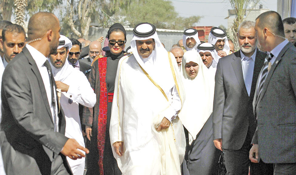 قام أمير دولة قطر الشيخ حمد بن خليفة آل ثاني أمس بزيارة "تاريخية" إلى قطاع غزة هي الأولى لرئيس دولة منذ أن سيطرت حركة حماس عليه في 2007. وقدمت حركة حماس كل مظاهر سلطة الدولة من النشيد الوطني إلى حرس الشرف والسجاد الأحمر وحضور "السيدتين الأوليين". وكان مقرراً أن تستمر الزيارة أربع ساعات، لكنها اختصرت قبل نهاية برنامجها بقليل لأسباب لم تُوضَّح. واستقبل رئيس الحكومة المقالة إسماعيل هنية أمير قطر لدى وصوله إلى معبر رفح قادماً من مصر. ووقف الرجلان متباعدين عندما عزف النشيدان الوطنيان الفلسطيني والقطري، ثم تقدما على السجادة الحمراء تتبعهما زوجتاهما الشيخة موزة المعروفة بأناقتها وقامتها الرشيقة وآمال "أم العبد" زوجة هنية التي ارتدت حجاباً بسيطاً في أول مشاركة لها في حدث سياسي.
