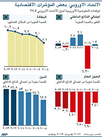أعلنت المفوضية الأوروبية تخفيض توقعاتها للنمو الاقتصادي في منطقة اليورو تخفيضا حادا. وتشير التوقعات الجديدة إلى أن المجموعة الأوروبية سوف تتجنب الكساد العام المقبل، ولكن بنسبة ضئيلة جدا وأن النمو الاقتصادي العام المقبل لن يتعدى 0.1 في المئة مقارنة مع تقديرها السابق وهو 1 في المئة. كما تتوقع أن ينكمش الاقتصاد الأوروبي هذا العام.كما تتوقع المفوضية أن تواصِل البطالة في الاتحاد الأوروبي ارتفاعها العام المقبل. وقد تسبب هذا التصحيح لتوقعات النمو الاقتصادي بخفض جديد بأسعار الأسهم. فقد أغلق سوقا باريس وفرانكفورت للأسهم على انخفاض قدره 2 في المئة، بينما انخفض مؤشر الفاننشال تايمز 100 في سوق لندن بنسبة 1.6 في المئة. أما مؤشر الداو جونز المتخصص بسوق نيويورك للأسهم فقد انخفض بأكثر من 2 في المئة في التداول صباح امس الاول.