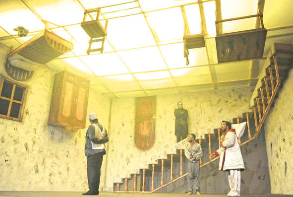 خمس شخصياتوفي نص البلوشي هناك خمس شخصيات، بينها شاب أعمى يجلس على مقعد وأمامه تلفزيون، ولا يصدر إلا صوت التشويش الذي يكون في مستوى منخفض قليلا، وبالتدريج يرتفع ويصل إلى الإزعاج فيذهب ليغلق الجهاز، ويعلق بعدها «نحن أكثر من ستين عاماً نعيش في خرابة»، إذ الموازين تختل والقيم تضيع، فكل شيء يتحول... البرتقال إلى حصى، والزيتون إلى قطع صغيرة من الفلين، والسماء تصبح في الأسفل والأرض مكانها.بعد ذلك تنكشف الشخصيات الأربع الأخرى الرئيسية، «الأول» هو فلسطيني مسلم، و»الثاني» ألماني مسيحي، و»الثالث» يهودي – إسرائيلي، و«الرابع» يمثل القوى العظمى، جميعهم يعيشون في منزل قديم، كل شخصية تصف المكان كالباب المقلوب والشبابيك المحكمة والمغلقة والسلم المعكوس، والرابع يتحكم فيهم فلا مجال للهرب. ويلعب الفلسطيني واليهودي الشطرنج، ويتراهنان: الأول على مفتاح البيت والآخر بالنقود، فيحتفظ اليهودي بالمفتاح، كدلالة على بيع الأرض (فلسطين)، ويبدأ اليهودي بتذكر محرقة «الهولوكوست» في الأول من أغسطس وهو يوم ميلاده، حينما أباد هتلر اليهود إبادة جماعية. و«الأول» يسخر من كلام اليهودي عندما قال عنهم ابرياء، مؤكدا ان هذه الكلمة فقدت إنسانيتها عند الحصار، وعلى وقع الصواريخ والقذائف والرصاص كإشارة للحصار الذي فرضه الإسرائيليون على الفلسطينيين مثل حصار غزة، وقد فقد زوجته وابنته التي لم تكمل عشرة أعوام.صراع على الكرسيثم تبدأ لعبة أخرى تمثل الصراع بين الفلسطيني واليهودي على الكرسي، ويأتي الحل بتقسيم الكرسي على اثنين، ويستمر الصراع على مفتاح المنزل (الأرض)، أما الرابع فيتركهم ويخرج من الباب ويغلقه عليهم كدلالة على الولايات المتحدة الأميركية التي تفرض سيطرتها على العالم كقوى عظمى.سينوغرافيا العمل من الناحية البصرية جميلة، خاصة في الديكور، وهو هنا في وضع مقلوب، فالأثاث والأبواب والشبابيك والسلم موجودة في الأعلى بصورة عكسية تماما، وتتلاقى مع الإضاءة ومؤثراتها وحركة الممثلين في سينوغرافيا بصرية صممت بدقة وإبداع.أما الإخراج فقد استطاع المخرج المعتوق تقديم مسرحية سياسية بحتة، لم يختلف فيها مع فكرة النص، رغم عدم تطبيقه كل إرشادات المؤلف المسرحية.شخصيات العرض: بدا الرابع كأنه شخصية «الجوكر» في فيلم «الرجل الوطواط» من خلال المكياج، وهي شخصية تفهم قواعد اللعبة جيداً، أما اليهودي أو «الثالث» فلا توجد إشارات تدل على أنه يهودي – إسرائيلي إلا الحوار وكلامه، فالزي والمكياج لا يمثلان هذه الشخصية، وكذلك الأول الفلسطيني، وقد وضع خلف رأسه وسادة تدل على أنه يغط في النوم! يبقى أن نقول ان العرض كان جميلاً، ولعل البطل الحقيقي فيه هو السينوغرافيا.