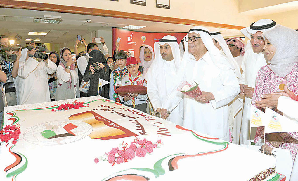 احتفلت وزارة التربية صباح امس باليوم العالمي للمعلم بحضور وزير المالية وزير التربية والتعليم العالي بالوكالة د. نايف الحجرف والقيادات التربوية والفلكي العم صالح العجيري وحشد من المعلمين والمعلمات والطلاب في المبنى الرئيسي للوزارة حيث قام الوكيل المساعد للأنشطة الطلابية راضي العويد بافتتاح الاحتفالية.وقال الوزير الحجرف: «اننا نلتقي في الاحتفال الخاص الذي تقيمه وزارة التربية بمناسبة اليوم العالمي للمعلم لنقف اجلالا وعرفانا منا بالجميل الذي قدمه لنا كل المعلمين والمعلمات ولسان حالنا يقول: قم للمعلم وفيه تبجيلا كاد المعلم ان يكون رسولا»، مضيفا أن المعلم في الكويت يحظى بالتقدير والرعاية من امير البلاد الشيخ صباح الاحمد بحضوره السنوى لاحتفالات تكريم المعلم التي تقيمها الوزارة وجمعية المعلمين، وهو محور اهتمام الوزارة والدافع لخدمة المنظومة التعليمية.