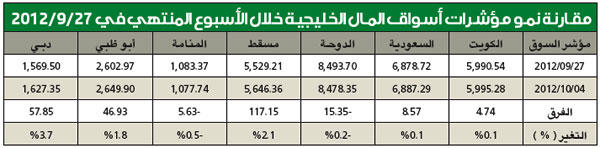 قرارات هيئة السلع بدبيقفز مؤشر سوق دبي بنسبة 3.7 في المئة ليصل الى اعلى مستوى له خلال ستة اشهر مقفلا عند 1627.35 نقطة بعد أن تقلصت مكاسبه خلال الجلسة الاخيرة التي شابتها عمليات جني ارباح لتبلغ مكاسبه الاسبوعية 57.85 نقطة محققا افضل مكاسب اسبوعية بين الاسواق الخليجية، وسط حالة من التفاؤل عقب إقرار مجلس إدارة هيئة الأوراق المالية والسلع إصدار أنظمة "صانع السوق" و"اقتراض الأوراق" و"البيع على المكشوف" و"توفير السيولة"، وهي الأنظمة التي يتوقع أن تحدث تحولا جوهرياً في أداء الأسواق المحلية خلال الفترة المقبلة.وارتفعت قيمته السوقية حوالى 3.7 مليارات درهم لتضاف الى مكاسب ابوظبي لتبلغ المكاسب السوقية في مؤشر سوق الامارات 7.8 مليارات درهم.وحقق مؤشر ابوظبي مكاسب جيدة هو الآخر غير انها دبي من سابقه بلغت 1.8 في المئة لتصعد به الى اعلى مستوياته خلال 14 شهرا عند مستوى 2649.9 نقطة محققا حوالي 47 نقطة خضراء، وكانت تداولات الاجانب عامل دعم حيث تخطت نسبة 53 في المئة بعد استقرار الاسواق العالمية وانتظار البيانات المالية للشركات المحلية للربع الثالث والتي يتوقع المحللون ان تكون ايجابية تزيد من تماسك مؤشرات سوقي الامارات عند اعلى مستوياتهما خلال هذه الفترة.وارتد سوق مسقط بعد فترة هدوء وتصحيح طالته لعدة اسابيع ليعود فوق مستوى 5646.3 نقطة رابحا 117.1 نقطة تعادل 2.1 في المئة كاعلى ثاني مكاسب خليجية بعد دبي، وتخلص السوق من رتم جني الارباح والتذبذب منطلقا الى تحقيق مكاسب مهمة بانتظار اعلانات الربع الثالث. مكاسب محدودة في الكويت والسعوديةرغم اختلاف اداء سوقي المملكة العربية السعودية والكويت فانهما تماثلا في المكاسب والبالغة عشر نقطة مئوية على كليهما، وانتهت فترة عمليات جني ارباح كبيرة كسر بها مؤشر تداول مستوى 7 آلاف نقطة طالته خلال الاسبوعين الاخيرين ليعود الى مستويات 6800 نقطة مرة اخرى ليستقر ويربح خلال الاسبوع الماضي عشر نقطة مئوية تعادل 8.57 نقاط ليقفل عند مستوى 6887.2 نقطة.واستمر السوق الكويتي في التحسن وبث الثقة بين متداوليه حيث ان عمليات جني الارباح كانت محدودة بعد مكاسب كبيرة خلال الاسبوعين الماضين انتهت خلال جلسة الخميس الى معانقة مستوى 6 آلاف نقطة بداية الجلسة قبل ان يتخلى عنه في نهايتها ويكتفي بالوصول الى مستوى 5995.28 نقطة مقتربا جدا ومستهدفا مستويات اعلى من ذلك بحوالي 200 نقطة على المستوى المتوسط، وكانت مكاسبه خلال الاسبوع 4.7 نقاط فقط.خسائر محدودةتراجع مؤشرا سوقي قطر والبحرين بنسب محدودة بلغت عشري نقطة مئوية في السوق القطري الذي تقهقر بعد ان تخطى مستوى 8500 نقطة خلال تداولات منتصف الشهر الماضي واقفل بنهاية الاسبوع المنصرم على مستوى 8478.3 نقطة بعد خسائر وصلت الى 15.35 نقطة متريثا حتى موعد افصاحات شركاته المدرجة القيادية منها.وعاد سوق المنامة الى سيرته الحمراء مرة اخرى بعد ان كاد يتحسن ويتماسك بنهاية الاسبوع الاخير من الشهر الماضي واقفل مؤشر سوق البحرين عند مستوى 1077 نقطة خاسرا نصف نقطة مئوية تعادل 5.63 نقاط، وتستمر الاوضاع السياسية بلعب دور كبير في تحديد اتجاه المؤشر الذي ما انفك عن التراجع سوى في جلسات محدودة خلال هذا العام.
