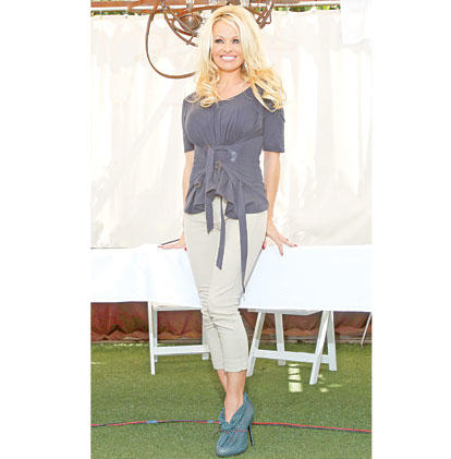 النجمة الأميركية باميلا أندرسون خلال حضورها أمس الأول مؤتمرا صحافيا لإطلاق الموقع الإلكتروني الإعلاني FrogAds.com في كاليفورنيا. (رويترز)