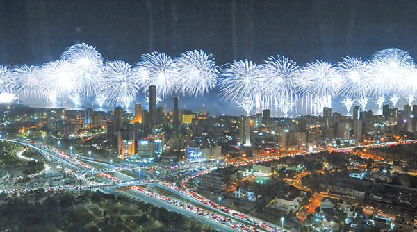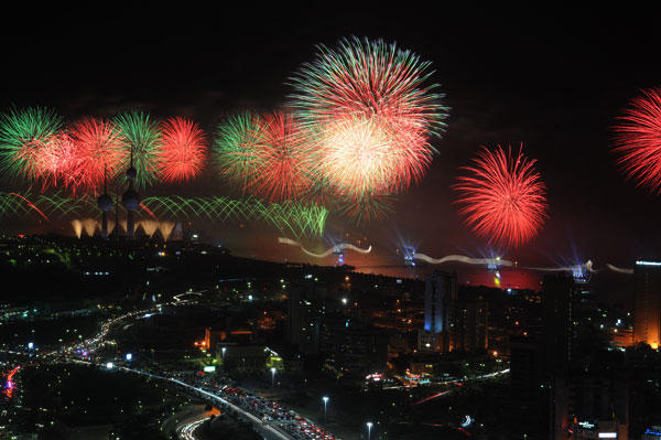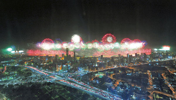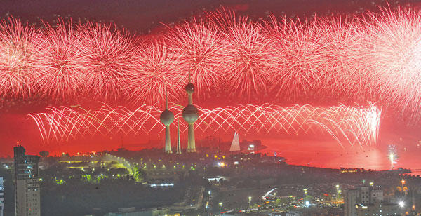 بحضور سمو أمير البلاد الشيخ صباح الأحمد ورئيس الوزراء سمو الشيخ جابر المبارك، سجلت دولة الكويت رقماً قياسياً غير مسبوق ضمن موسوعة «غينيس» للأرقام القياسية بأكبر تنظيم للألعاب النارية في العالم عبر 77 ألفاً و282 مقذوفاً نارياً، استُخدِمت في الألعاب النارية التي ازدانت بها سماء منطقة الاحتفال بمناسبة مرور 50 عاماً على المصادقة على دستور دولة الكويت في شارع الخليج العربي أمس.وفضلاً عن الألعاب النارية التي ازدانت بها سماء منطقة الاحتفال على امتداد شارع الخليج والأبراج، والتي شوهدت من مسافات بعيدة وأعطت صوراً بمختلف الألوان والأشكال، شهد الاحتفال عروضاً ضوئية وليزرية انعكست صورة جمالية رائعة على الأبنية والأبراج، تناغمت بدورها مع الموسيقى وأغاني "اليامال"، ما شكل لوحة فنية معبرة عن رمزية الاحتفال بهذه المناسبة الوطنية. وأقيمت أيضاً ضمن الفعاليات عروض فنية ورياضية من ارتفاعات عالية، فضلاً عن تحليق طائرات ورقية على شكل رموز كويتية إلى جانب إضاءة ليزرية عمودية مثبتة على شاطئ البحر.