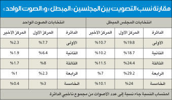 وتم احتساب نسبة التصويت عن طريق قياس عدد الاصوات الحاصل عليها كل من الفائز الاول والاخير في كل دائرة انتخابية نسبة الى عدد المقيدين في جداول الانتخابات لكل منها.وبالمقارنة بين نتائج المركز الاول والاخير لكل دائرة من الدوائر الخمس سواء في المجلس المبطل والمجلس الحالي، تظهر نسب التصويت الحقيقية لكل من وصل الى البرلمان لتكشف حجم المقاطعة الكبير وانخفاض نسب التصويت.وتظهر الاحصائية ان صاحب المركز الاول في الدائرة الاولى بالانتخابات الماضية حصل على 19.8%، والاخير على 10.7%، في حين حصل صاحب المركز الاول في انتخابات «الصوت الواحد» على 7.7%، والاخير على 2.3%. اما الدائرة الثانية فحصل صاحب المركز الاول في الانتخابات الماضية على 18.7%، والاخير على 10.2%، وفي انتخابات الصوت الواحد جاء صاحب المركز الاول بتمثيل 6.04%، والاخير بـ 1.9%.وفي الدائرة الثالثة حصل صاحب المركز الاول في انتخابات المجلس «المبطل» على 24.4% والمركز الاخير على 11.5%، في حين حصل صاحب المركز الاول في انتخابات المجلس الاخير على 8%، والمركز الاخير على 1.7%.وحصل صاحب المركز الاول في الدائرة الرابعة بالانتخابات الماضية على 29.2% والمركز الاخير فيها على 7%، في حين حصد المركز الاول في الانتخابات الاخيرة 2.3%، والاخير 1%.ونال صاحب المركز الاول في الدائرة الخامسة في الانتخابات الماضية نسبة 24% والاخير 10.1%، في حين حاز المركز الاول في الانتخابات الاخيرة 3% من نسبة التمثيل، والاخير 0.4%.مع ملاحظة ان نتائج الانتخابات الحالية تمت وفق نظام «الصوت الواحد» بعكس الانتخابات الماضة التي جرت وفق الاصوات الاربعة، لكن مع حساب الاصوات الاربعة واسقاطها على الانتخابات الأخيرة، نجد عدم حدوث تغيير يذكر في حساب النسبة، إذ ان أعلى نسبة تصويت حصل عليها نائب في الانتخابات الأخيرة في حال ضربها في اربعة اصوات تصبح 32 في المئة، بينما من حصل على اقل نسبة اصوات في انتخابات الصوت الواحد سيحصل على 1.6 في المئة.وهذا ما يشير الى المقاطعة التي شهدتها الانتخابات الاخيرة وتدني نسبة المشاركة الشعبية فيها.