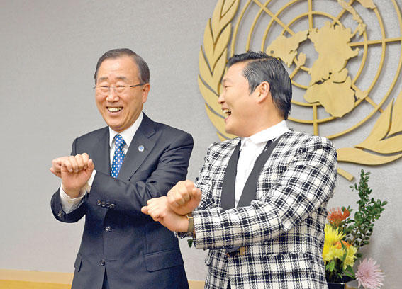 أظهر أمين عام الأمم المتحدة بان كي مون، أمس الأول، جانبا مرحا في شخصيته، حين حاول أن يتعلم من مواطنه المغني ساي، رقصته الشهيرة «ركوب الحصان» أمام الصحافيين، في مقر المنظمة الدولية بنيويورك.وبعد لقائهما في مكتب بان في نيويورك، حاول المغني، الذي اشتهر عالمياً في الآونة الأخيرة بأغنية «كانغ نام ستايل»، تعليم بان رقصة «ركوب الحصان»، ووضع الأمين العام بالفعل معصميه فوق بعضهما وحركهما صعودا ونزولا بحركة متوجة، قبل أن ينفجر الاثنان والصحافيون ضاحكين.