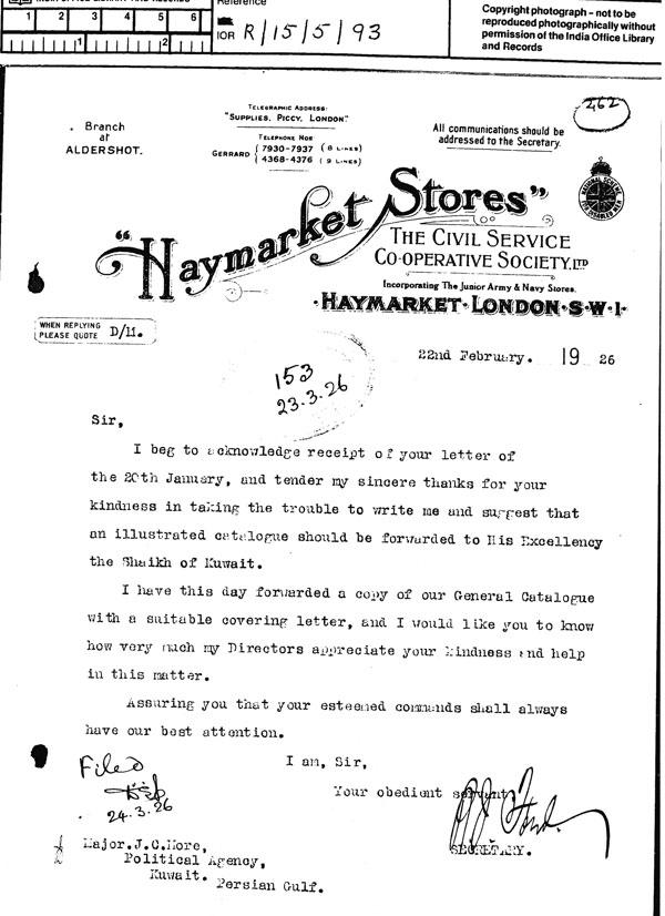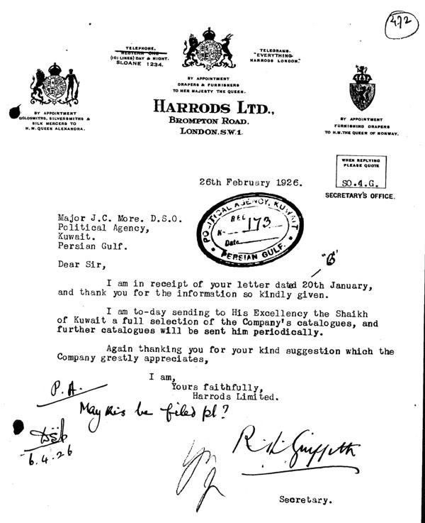 ورغم أن الكويت بلد صغير وفقير في تلك الفترة، والنفط لم يستخرج بعد، ولم تظهر على الشعب مظاهر الثروة والغنى، فإن الشركات الإنكليزية كانت مهتمة بتسويق منتجاتها في الكويت، وبدأت بمراسلة حاكم الكويت آنذاك الشيخ أحمد الجابر الصباح وعرضت عليه ما لديها من بضائع ومنتجات.وقد عثرت على بعض الرسائل النادرة التي تشير إلى هذه المراسلات، ومنها رسالة من محلات "هارودز" الشهيرة التي مازالت موجودة حتى اليوم، ولها سمعة عالمية مرموقة.تقول الرسالة المطبوعة بالآلة الكاتبة باللغة الإنكليزية والموجهة إلى المعتمد البريطاني في الكويت ما يلي: "إلى حضرة الكولونيل جي سي مور، المعتمد السياسي البريطاني في الكويت، تحية طيبة وبعد،لقد تلقيت رسالتكم المؤرخة بتاريخ 20 يناير (1926)، فشكراً لكم على المعلومات التي تضمنتها. إنني اليوم أرسل لسعادة شيخ الكويت مجموعة كاملة من دليل منتجات الشركة (كاتالوغات)، وسنستمرفي المستقبل في إرسال أدلة أخرى بشكل دوري. مرة أخرى نشكركم على مقترحكم الذي تنظر إليه الشركة باهتمام بالغ وتقدير".كما عثرت أيضاً على رسالة من شركة "بروك آند سن"، يعود تاريخها إلى عام 1926 أيضا، وهي موجهة إلى المعتمد البريطاني في الكويت، وإليكم نصها المترجم:"نفيدكم بأننا تلقينا رسالتكم بتاريخ 20 فبراير (1926) صباح اليوم، وأننا نود أن نعرب عن شعورنا بالمديونية لأنكم أشرتم إلى اسم شركتنا أمام سعادة شيخ الكويت. وتمشياً مع اقتراحكم، قمنا اليوم بإرسال نسخ من دليل منتجاتنا (كاتالوغاتنا) في البريد اليوم لسعادته، متمنين أن نستطيع التعامل التجاري مع الشيخ من خلال مساعيكم".وعثرت أيضا على رسالة ثالثة من شركة تسمى "هيماركت ستورز"، ويعود تاريخها إلى 22 فبراير 1926، وإليكم نصها المترجم:"نفيدكم بأننا تلقينا رسالتكم بتاريخ 20 فبراير (1926)، ونتقدم إليكم بخالص الشكر لطلبكم أن نرسل دليلنا التجاري لسعادة شيخ الكويت. لقد قمت اليوم بإرسال نسخة من دليل منتجاتنا (كاتالوغ) مرفق برسالة تغطية، وأود أن تعرف بأن مدراءنا ممتنون لك كثيراً على لطفك ومساعدتك لنا في هذا الأمر".