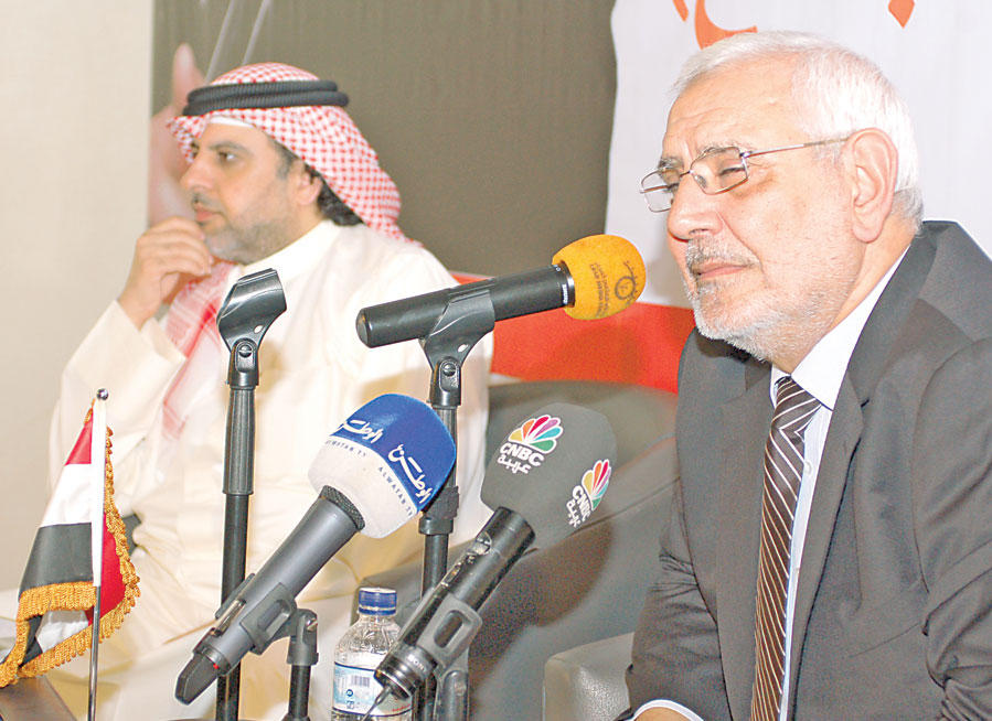 نخبة المصريينوقال أبوالفتوح في بداية حديثه انه مدين للمصريين في الكويت باعتذار لأنه لم يلتقهم اثناء حملته الانتخابية موجها الشكر لكل الذين أعطوه أصواتهم والذين لم يعطوه أيضا، مشيرا إلى أن المصريين في الخارج عانوا اهمالا شديدا من قبل النظام السابق رغم أنهم يعتبرون من نخبة المصريين الذين يجب على الوطن أن لا يفرط فيهم ولا في امكانياتهم.وأكد أبوالفتوح على أن الشباب المصري الذين ضحوا بأرواحهم في ثورة الخامس والعشرين من يناير لم يكونوا أبدا يطمعون بمناصب أو يسعون وراء تحقيق أي مكاسب "فهؤلاء شباب نفتخر بهم لأنهم أبوا إلا أن يغيروا تاريخ مصر إلى الأفضل".وأضاف أبوالفتوح ان الثورة المصرية نجحت لأنها اعتمدت على الشباب ولأن الشعب هو من كان قائدها ولأنها ثورة سلمية عبرت عن معاناة شعب كامل، "ولا يجوز أبدا بكل هذه التضحيات أن يكون هناك أي تقصير في حق الشهداء الذين ضحوا بأرواحهم من أجل أن تنعم مصر بالتقدم والديمقراطية والحرية". العمل التطويوحول العمل التطوعي والمشاركة الشعبية أكد أبوالفتوح أنه مازال الكثيرون في مصر ينتمون إلى ما يسمى "حزب الكنبة" ولا يشاركون بجدية في صناعة مستقبل مصر، مشددا على أن بناء المستقبل وتحقيق اهداف الثورة يتطلب عملا مجتمعيا يشارك فيه الجميع، وأن فلسفتنا في مشروع مصر القوية ترتكز على عدة مرتكزات أساسية منها الرؤية الاسلامية الوسطية فالشعب المصري يعتز بكونه جزءا من الحضارة الاسلامية، إضافة إلى تحقيق العدالة الاجتماعية وأن الدولة واجب عليها أن تنحاز إلى الفقراء، كذلك الحرية وعدم اهانة كرامة الانسان فالإنسان قيمة وليس رقما في سجلات الدولة ولا ينبغي أبدا لأي إنسان يحترم نفسه أن ينتمي إلى كيان أو دولة تعامله معاملة القطيع، مشيرا إلى وثيقة الأزهر للحريات التي أكد على ضرورة تفعيلها وأنها تعتبر أحد مرتكزات مشروع مصر القوية.حسن البناواستطرد بالتأكيد على ضرورة استقلالية الوطن والخروج من تحت عباءة التبعية فيما يتعلق بالسياسة الخارجية والاعتماد على سياسة خارجية تقوم على تحقيق المصالح المتبادلة لأن السياسة الخارجية ليست جمعية خيرية ولا يجب ابدا أن تكون على حساب كرامة مصر والمصريين.وقال أبوالفتوح إن المصريين في الخارج يحترمون الخيارات السياسية للمجتمعات والدول التي يقيمون فيها ولا يتدخلون ابدا في شؤونها الداخلية ولا نقبل ابدا أن يتدخل مصري في سياسة دولة يقيم فيها.وشدد أبوالفتوح على أن الاخوان المسلمين قد خرجوا عن منهج حسن البنا عندما دخلوا في المعترك السياسي لأن الإسلام يحتاج إلى الدعوة أكثر من أي شيء آخر وهذا هو دور الجماعة لنشر الفكر والتسامح وهذا هو المطلوب من المؤسسات الدينية كلها.