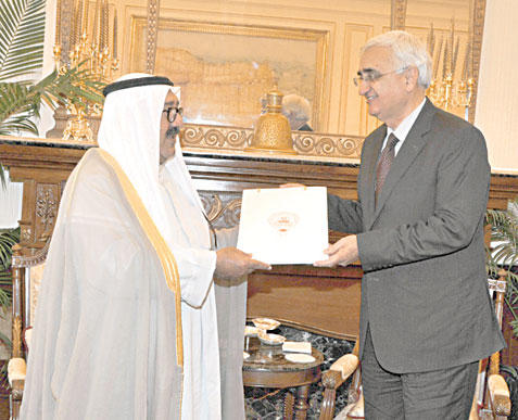 سلم وزير شؤون الديوان الاميري الشيخ ناصر صباح الاحمد وزير شؤون الخارجية الهندي سلمان خورشيد رسالة خطية من سمو أمير البلاد الشيخ صباح الاحمد الى رئيس جمهورية الهند الصديقة برناب موخرجي، تتضمن دعوة لزيارة دولة الكويت في الموعد الذي يحدده الرئيس موخرجي.وكان الشيخ ناصر قد اجتمع في وقت سابق بوزير شؤون الخارجية الهندي سلمان خورشيد في حيدر أباد هاوس في العاصمة الهندية نيودلهي، حيث تم خلال الاجتماع بحث العلاقات الثنائية بين البلدين في كل المجالات.