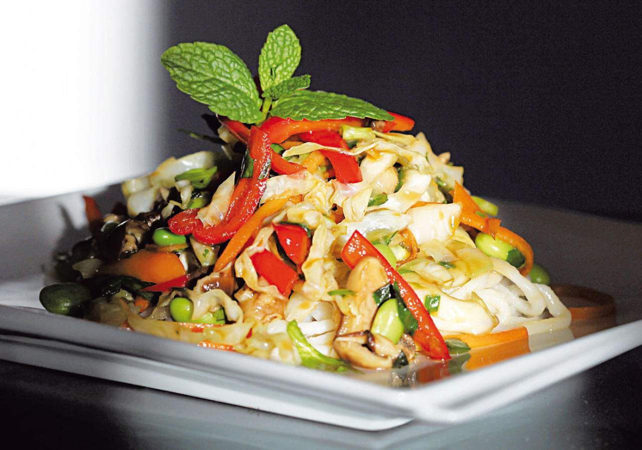 هذه الوصفة متعددة الاستعمالات. يمكن تحضير الصلصة مسبقاً والاحتفاظ بها لاستعمالها في أطباق متنوعة أيضاً. يمكنك استعمال أي أنواع من الخضار. بعد جمع المقادير، يسهل تحضير الوصفة بسرعة. يمكنك تقطيع جميع أنواع الخضار مسبقاً أو فرمها وتحضيرها أثناء طبخ الصلصة على النار.لتحضير الصلصة، احرصي على استعمال صلصة الصويا القليلة الصوديوم. بما أن الصلصة تُطبَخ على النار لفترة معينة، تزداد قوة النكهة. إذا استعملت صلصة الصويا العادية، ستكون مالحة أكثر من اللزوم.عند اختيار صلصة الصويا القليلة الصوديوم، احرصي على قراءة الغلاف لأنها قد تحتوي رغم كل شيء على كمية كبيرة من الملح.ننصح باختيار النودلز الصينية الطازجة. قدمي هذه السلطة دافئة أو باردة. لن تستعملي كمية الصلصة كلها. يمكنها أن تدوم طوال أسبوعين ويمكن استعمالها لتحضير خلطات الخضار الصيني وسلطات أخرى.المقاديرعلبة من النودلز الصينية الطازجة (اختياري) الصلصة- كوب ونصف الكوب من صلصة الصويا القليلة الصوديوم.- قطعة من الزنجبيل الطازج المقشّر والمقطّع.- باقة من البصل الأخضر المفروم (حوالى 6 حبات، القطع البيضاء والخضراء معاً).- 4 فصوص ثوم مقشرة ومهروسة.- ملعقة كبيرة من زيت السمسم.- عصير ليمونة.- ملعقة كبيرة من رحيق الصبار الأميركي.- ملعقة كبيرة من نشاء الذرة مع نصف كوب من الماء الباردة. السلطة- ملعقة كبيرة من زيت الكانولا.- كوب ونصف الكوب من فطر «شيتاكي» مع نزع الجذور وتقطيع الحبات بسماكة ربع إنش.- حبتا جزر كبيرتان ومقشرتان ومقطعتان إلى شرائح مستطيلة.- حبة فليفلة حمراء مقشرة ومنزوعة البذور ومقطّعة إلى شرائح مستطيلة.- نصف حبة ملفوف أخضر مفروم.- 3 حبات ملفوف صيني مقطّع إلى شرائح بحجم إنش.- كوب من البازلاء العريضة (أدامامي) المثلجة.- قبضة من البصل الأخضر (حوالى 6 حبات، القطع الخضراء فقط).- كوب من الكزبرة المفرومة.- باقة من النعناع المفروم.- نصف كوب من اللوز المقطّع والمحمّص.الطريقة-1 عند تقديم السلطة فوق النودلز الصينية، ننصح بطبخها وفق التعليمات المذكورة على الغلاف. جففيها وضعيها جانباً.-2 لتحضير الصلصة: ضعي جميع مقادير الصلصة في طنجرة واغليها ثم خففي الحرارة. دعيها على حرارة منخفضة مدة تتراوح بين 10 و15 دقيقة. ستصبح الصلصة أكثر سماكة. انزعيها عن النار وضعيها جانباً كي تبرد. حين تبرد بالكامل، اسكبي الصلصة في كوب أو وعاء وضعيها في البراد حتى تصبح جاهزة للاستعمال. إذا كنت لا تريدين استعمالها فوراً، اسكبي الصلصة في وعاء له غطاء يمكن إغلاقه بإحكام وضعيه في الثلاجة لمدة تصل إلى أسبوعين.-3 لتحضير السلطة: في مقلاة كبيرة، سخني الزيت. أضيفي الفطر وقلّيه إلى أن يصبح طرياً. أضيفي الجزر والفليفلة الحمراء والملفوف وقلّيها مدة دقيقة. ثم اسكبي الملفوف الصيني والبازلاء والبصل الأخضر وقلّي الخليط مدة دقيقتين. انزعي الخليط عن النار. أضيفي الكزبرة والنعناع وقلّبيها كي تنخلط المقادير جيداً. رشي فوقها حوالى ثلث كوب أو أكثر من الصلصة. اسكبي الخليط فوق النودلز مع صلصة إضافية إلى جانب الطبق. زيني الطبق باللوز.المحتوى الغذائي: 333 سعرة حرارية (30% من الدهون)، 12 غراماً من الدهون (غرام من الدهون المشبعة)، 47 غراماً من الكربوهيدرات، 13 غراماً من البروتينات، 908 ملغ من الصوديوم، 5 ملغ من الكولسترول، 7 غرامات من الألياف.