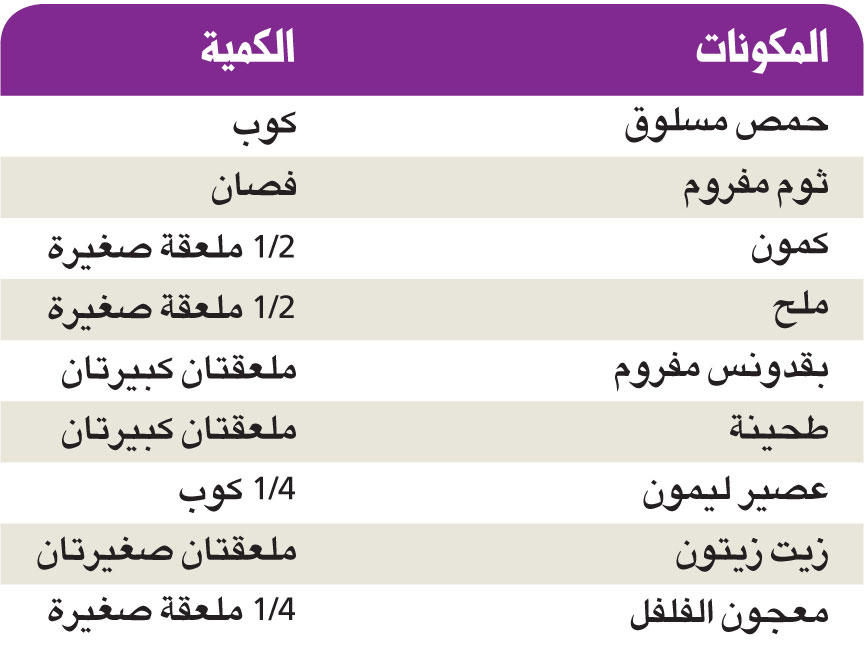 -1 اخلطي الثوم والملح والكمون ومعجون الفلفل والطحينة وعصير الليمون، ثم قلبي الخليط حتى يتجانس. -2 اهرسي الحمص المسلوق جيداً، ثم أضيفيه إلى الخليط وقلبي المقادير.-3 في طبق التقديم، ضعي خليط الحمص والطحينة، ثم أضيفي زيت الزيتون وزيني الطبق بالبقدونس المفروم وقليل من الحمص المسلوق غير المهروس.