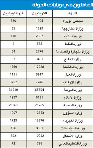 أجرت الإدارة المركزية للإحصاء إحصاء للعاملين في الجهات الحكومية والشركات المملوكة ملكية كاملة للدولة، وذلك رغبة منها في توفير مجموعة من البيانات تغطي احتياجات المخططين والباحثين والمهتمين بالقطاع الحكومي في الدولة، فضلاً عن تكوين قاعدة بيانات تفيد الجهات الحكومية بتعاطيها مع ملف العمالة والبطالة بين المواطنين.واستناداً إلى الإحصاء الذي أجري العام الماضي ونشر العام الحالي، فقد بلغ عدد العاملين في الجهات الحكومية 331333 شخصاً، منهم 240 ألف كويتي بنسبة 72.5 في المئة، علماً بأن هذه النسبة تتغير بين جهة حكومية وأخرى، فضلاً عن أن القسم الأكبر من المواطنين يعمل في وزارتي التربية والصحة.